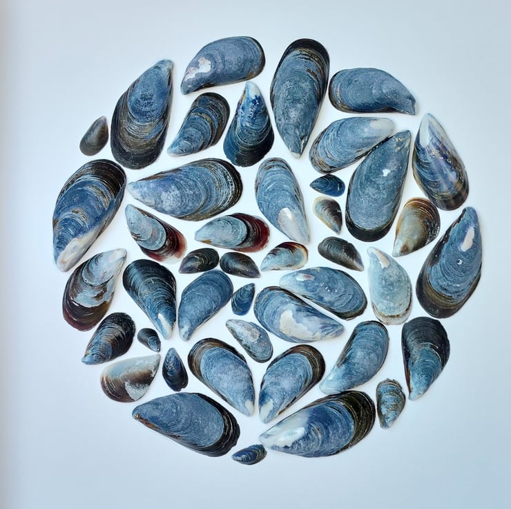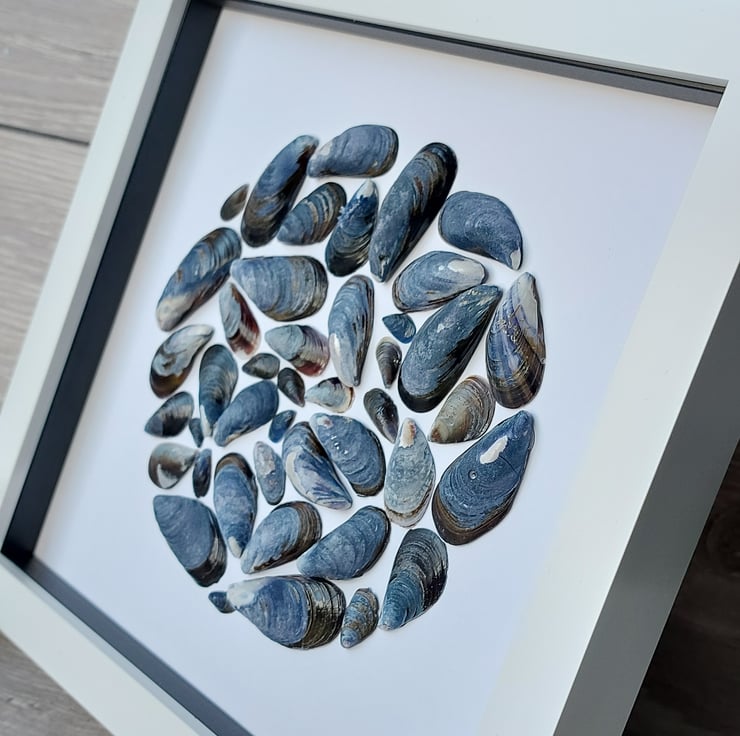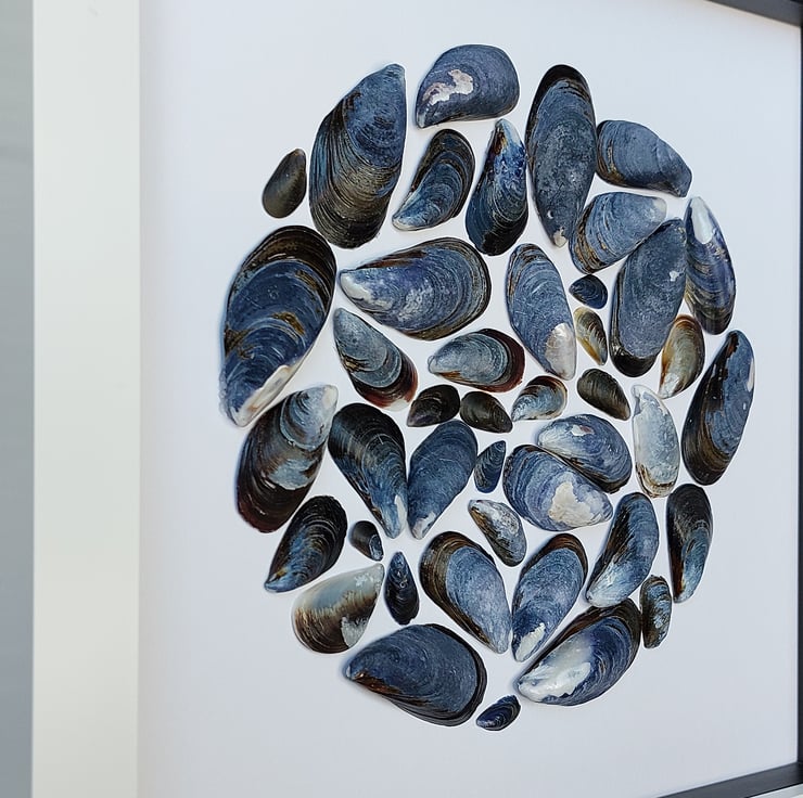 I just love the colours of mussel shells. So I make these pictures in a simple white frame, with black insert to show off their beauty.