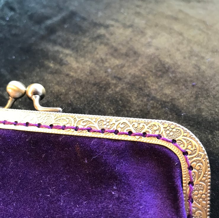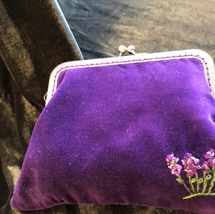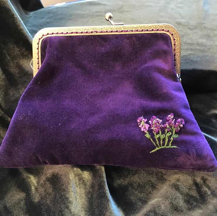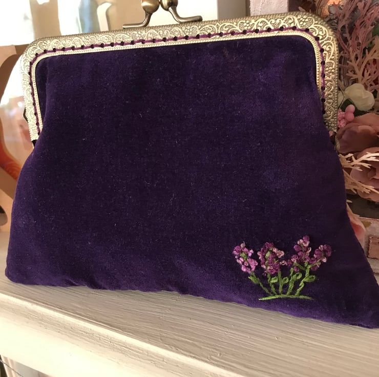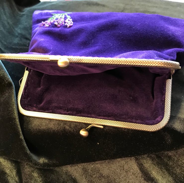 A beautiful clasp purse with a velvetey vintage feel about it. The fabric is a lush firm velvet and i have added some embroidery of lilac and purple flowers. The lining is in the same fabric . It would look great for a evening out or a special occasion. Just ready for a Christmas or a new years eve do. It is set in a 15cm antique brass effect clasp frame and has been sewn in with a complimentary purple shade of thread. The measurements are 21cm at the widest point and 16cm deep.
