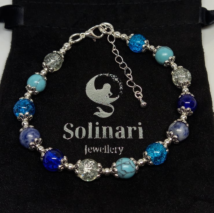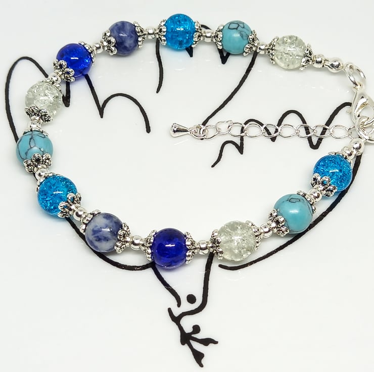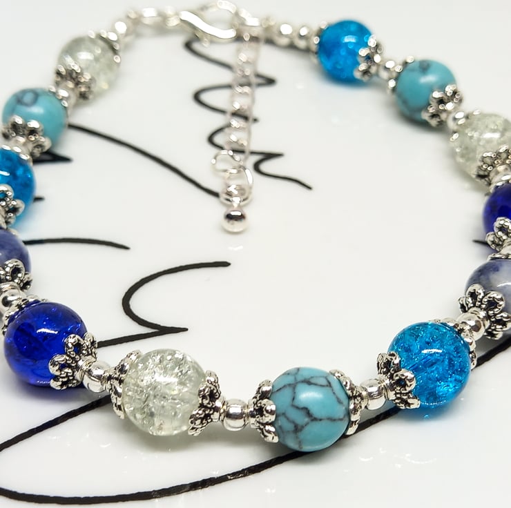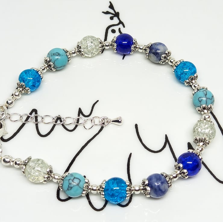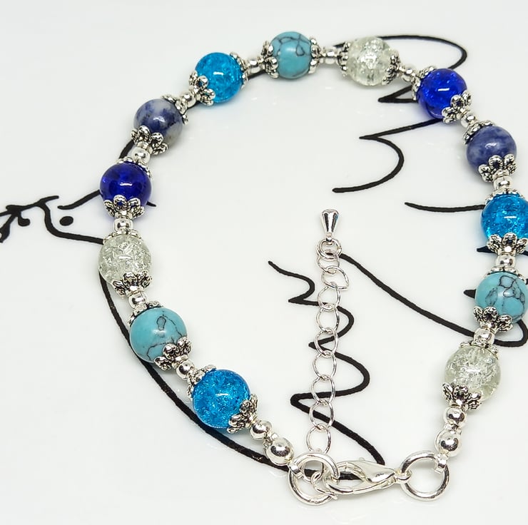Pretty blue & silver adjustable beaded bracelet with 8 mm lapis lazuli, dyed blue howlite and turquoise & clear crackle glass beads.