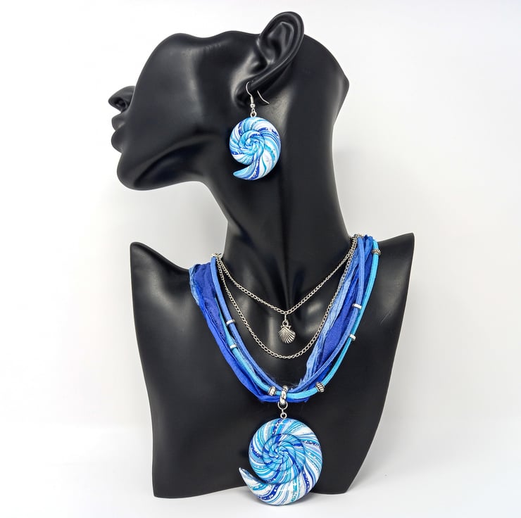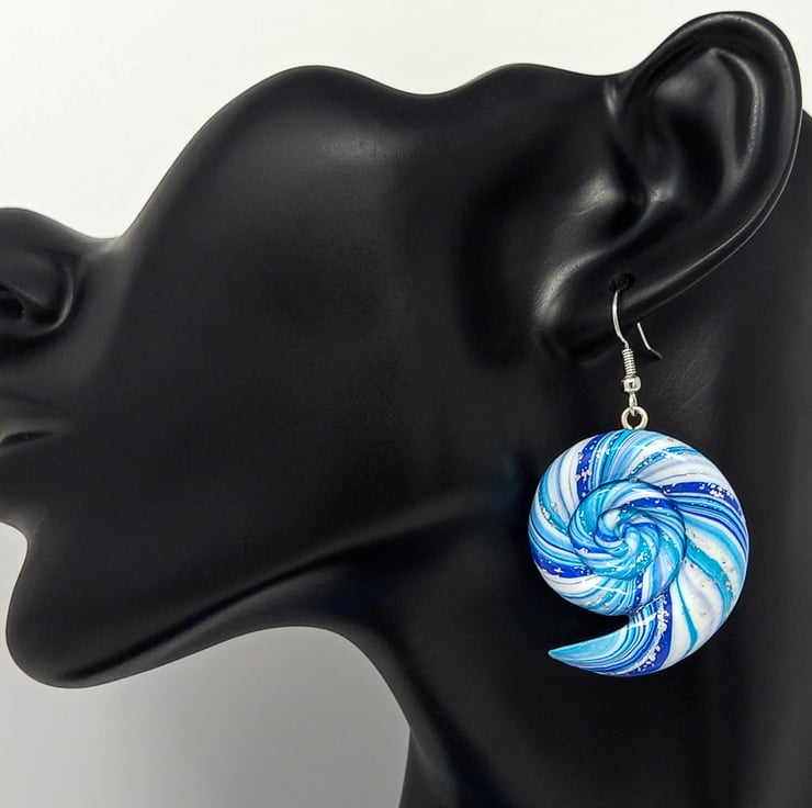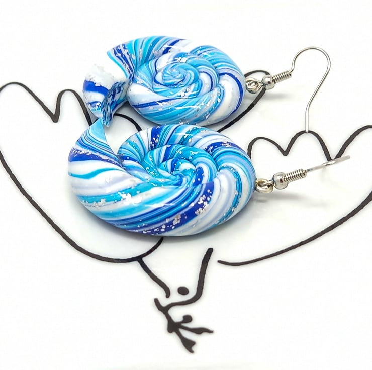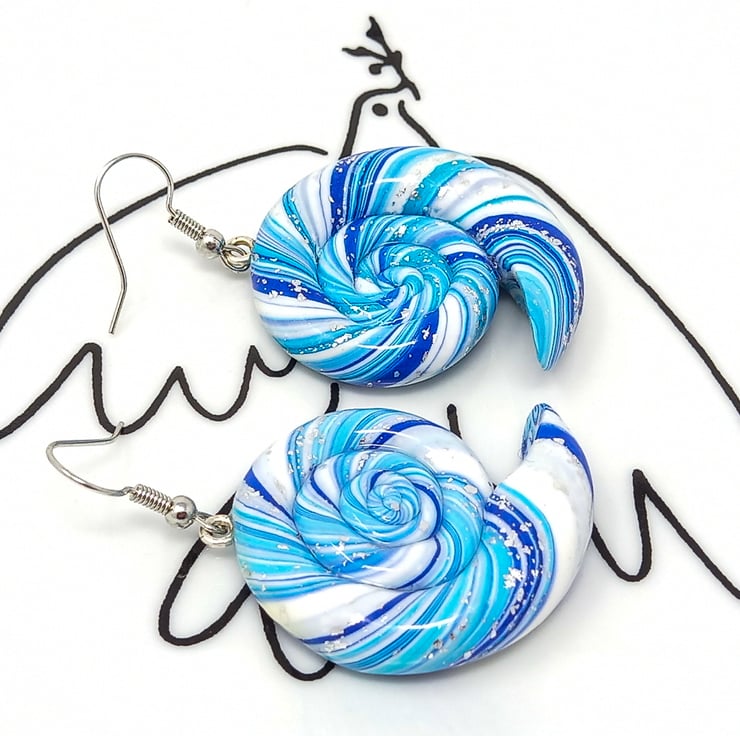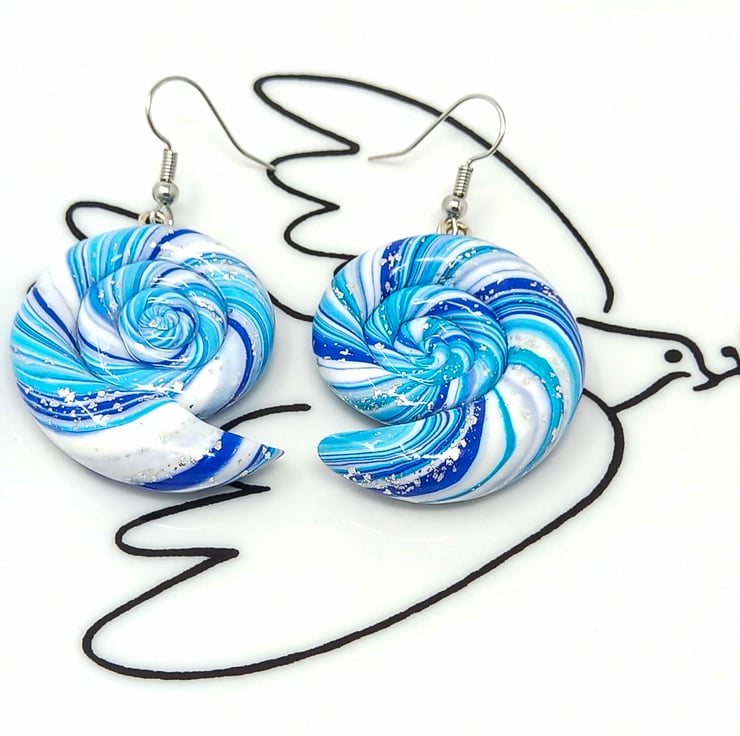 Handmade nautilus spiral earrings in blue, white and silver with hypoallergenic silver tone ear wires.