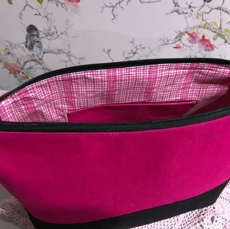 This is a medium sized project bag that is ideal for large shawls, smaller sweaters and sewing projects. There is an internal pocket for items such as stitch markers, scissors and a needle gauge. The outer colour is a hot pink canvas and black wool. The lining is a cotton print. The wool is ex saville row cloth so a superb grade that doesn’t attract lint. It’s ideal to store 3 skeins and a project. The opening is 11” (28cm) wide so would suit smaller straight needles. The dimensions are 13.75” (35cm) by 8.75” (22cm).