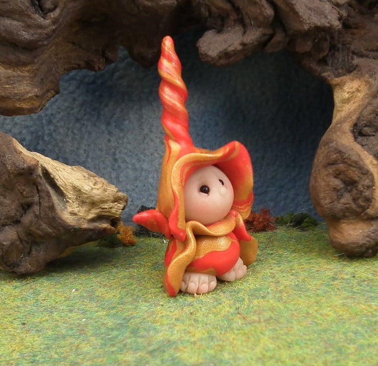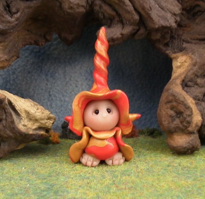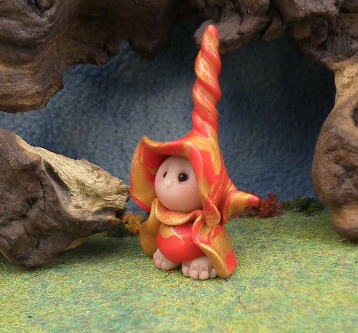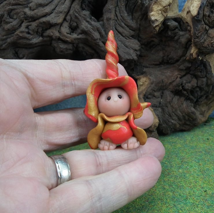 This is a 'one of a kind' creation having been entirely handmade without the use of moulds here at my studio on the Sussex Coast. Modelled with artist blend polymers, blushed before sealing with lacquer, Eloa has sparkling black onyx eyes and variegated robes. Eloa the HighHat Gnome is just one and a half inches tall.