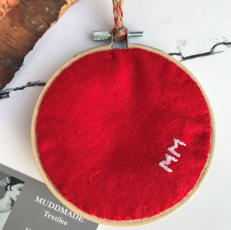 Santa’s face is surrounded with red thread French knots and is finished with a hanging loop plaited with natural jute and red twine, with the back covered in red felt with the initials MM embroidered in white, identifying the maker ‘MuddMade’