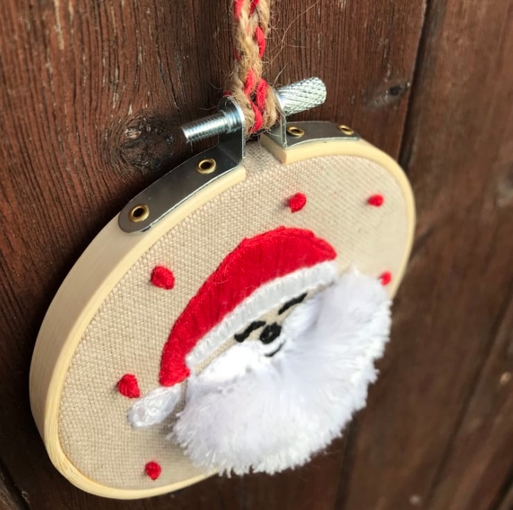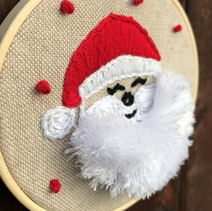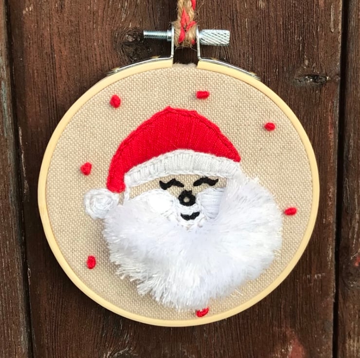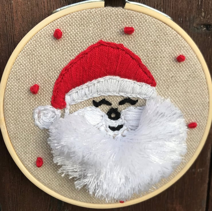 My own design ‘Laughing Santa’ complete with a big fluffy beard, framed on a 4” bamboo hoop.
