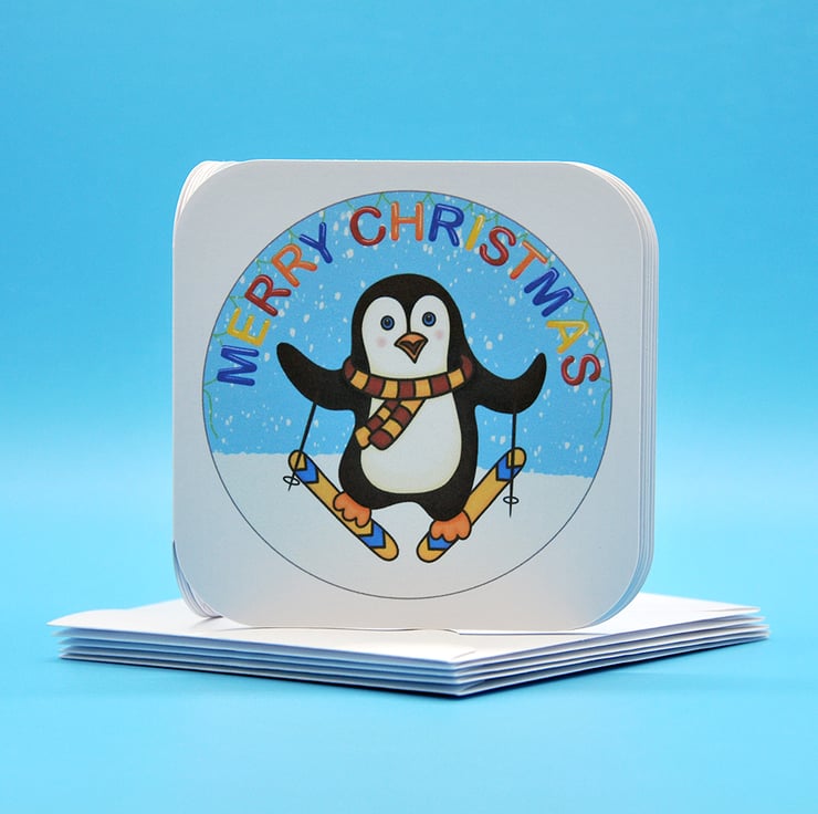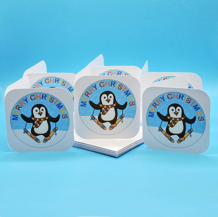 This pack of 6 Christmas cards features a cute little penguin skiing through the snow with the words Merry Christmas above.