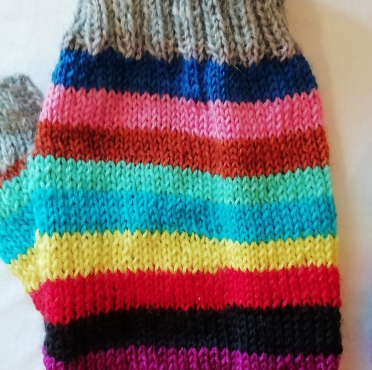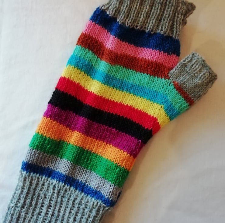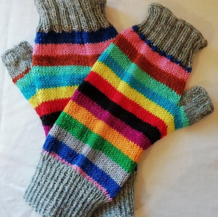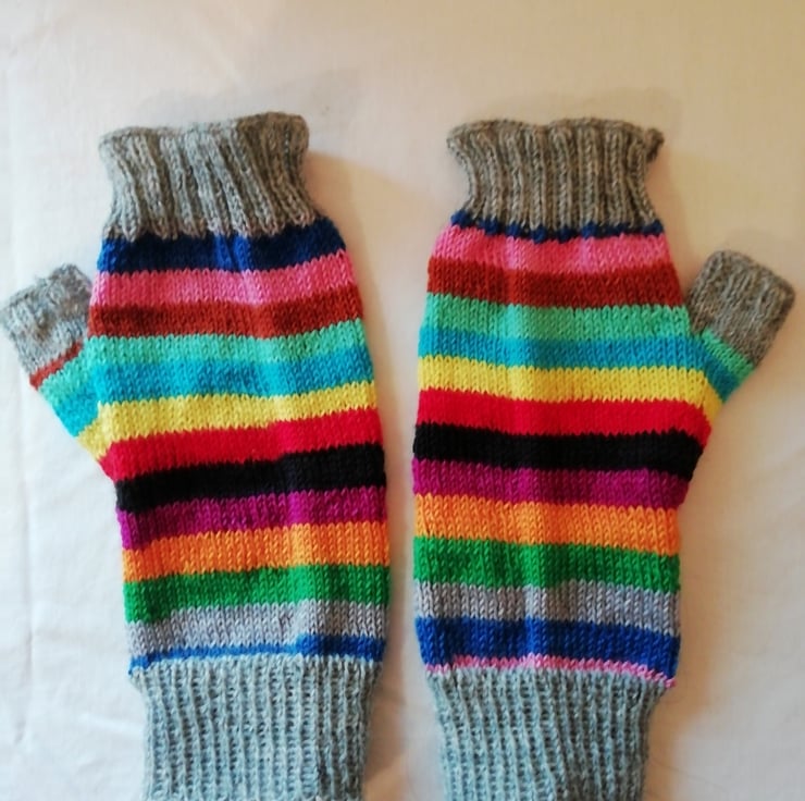 Hand knitted wool fingerless gloves made using a durable and comfortable 4 ply yarn comprising of 75% wool and 25% polyamide ensuring comfort and strength. Perfect for cooler days, the fingerless design allows you to still get things done without being restricted. The main yarn has been dyed in the colours of each of the main lines on the London Underground, and I have used a contrasting grey yarn for the tops and cuffs. This pair of gloves has been knitted in a traditional method using 4 double pointed needles, allowing for a comfortable finish with no bulky seams.
