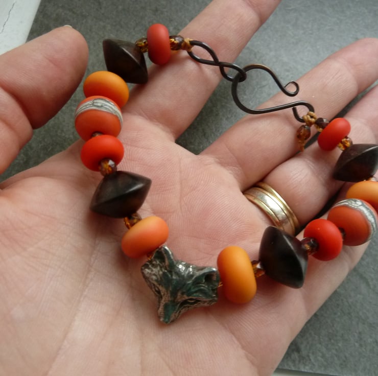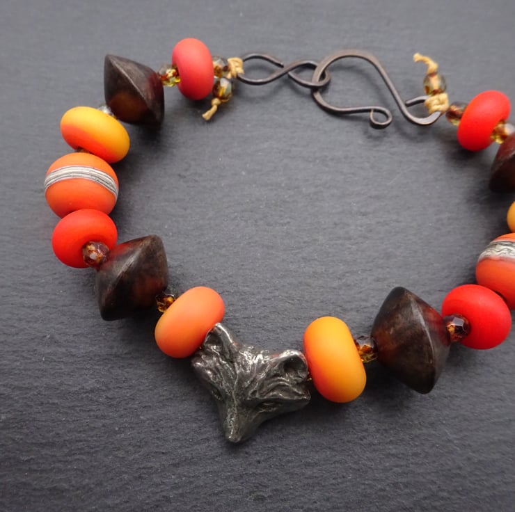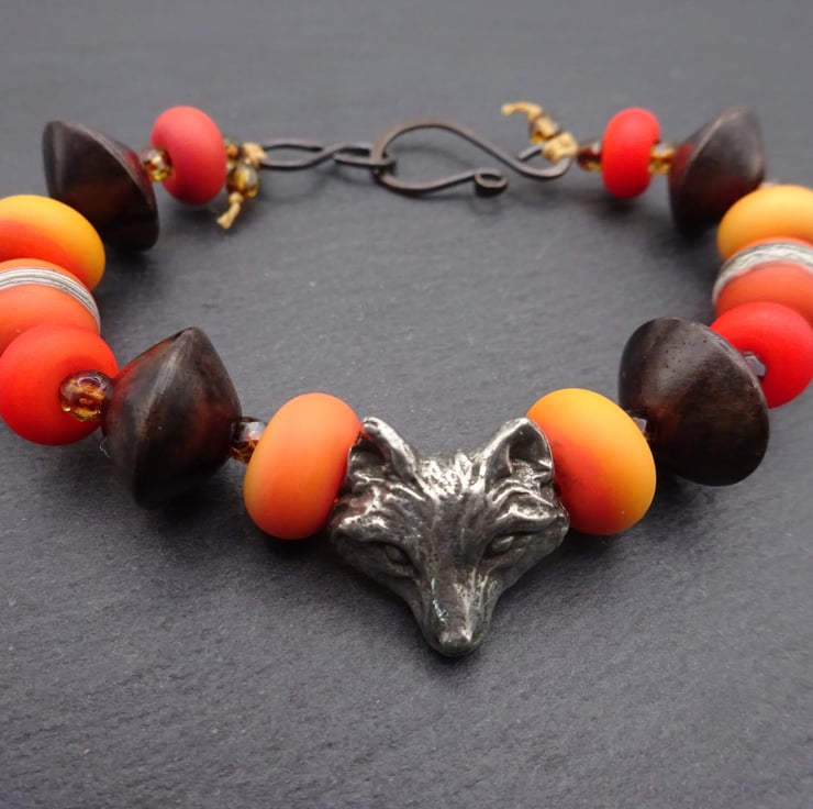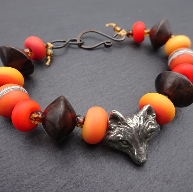A bracelet made with handmade lampwork glass beads, wood disc beads and a handmade pewter fox bead.