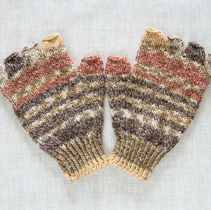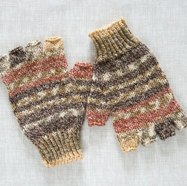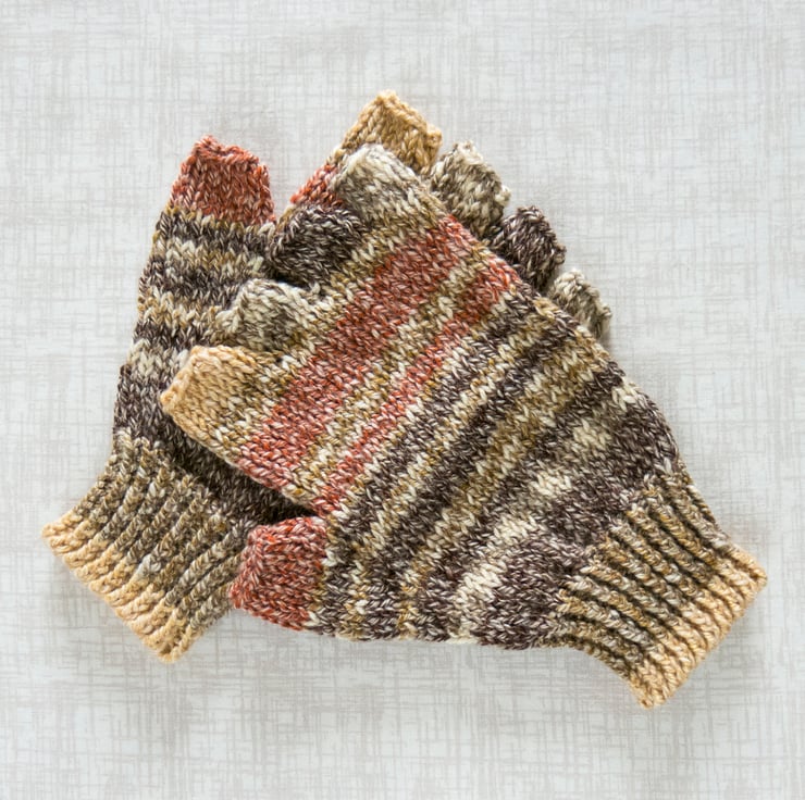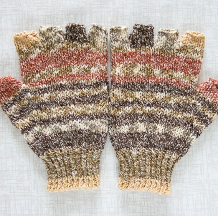 Hand knit short fingered gloves using a mock fairisle yarn, a variable shaded yarn creating a unique pattern in each pair. I take the trouble to roughly match the colourway to make a pair.