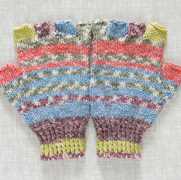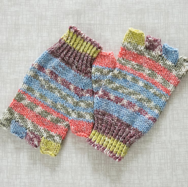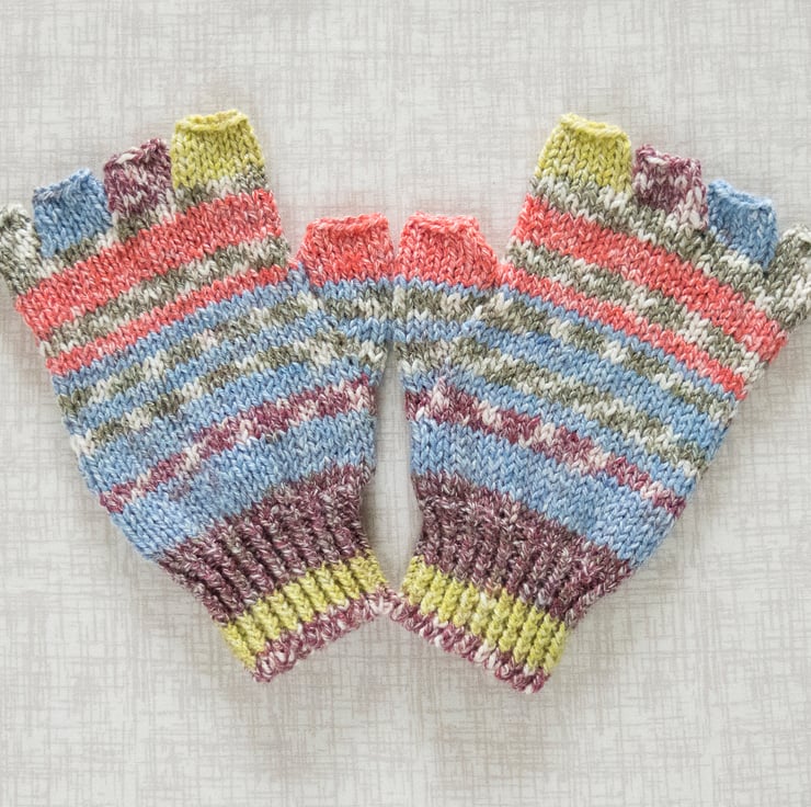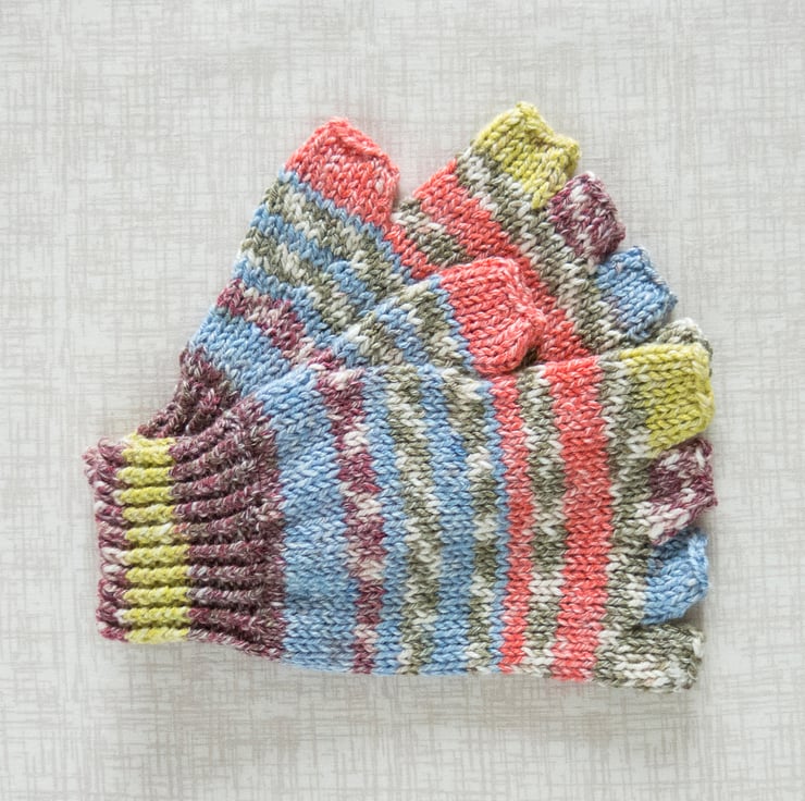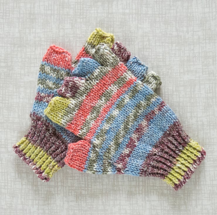 Hand knit short fingered gloves using a mock fairisle yarn, a variable shaded yarn creating a unique pattern in each pair. I take the trouble to roughly match the colourway to make a pair.