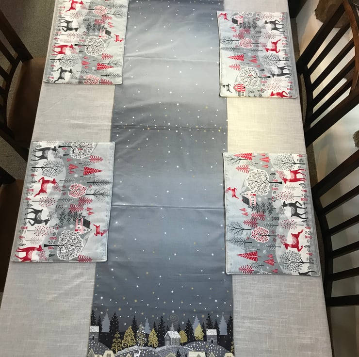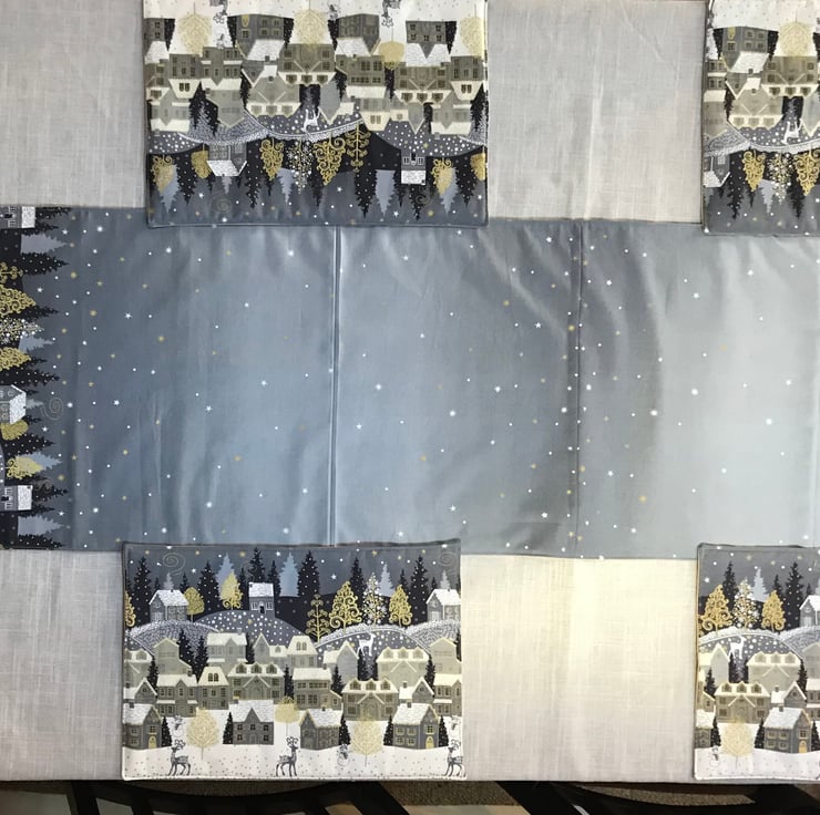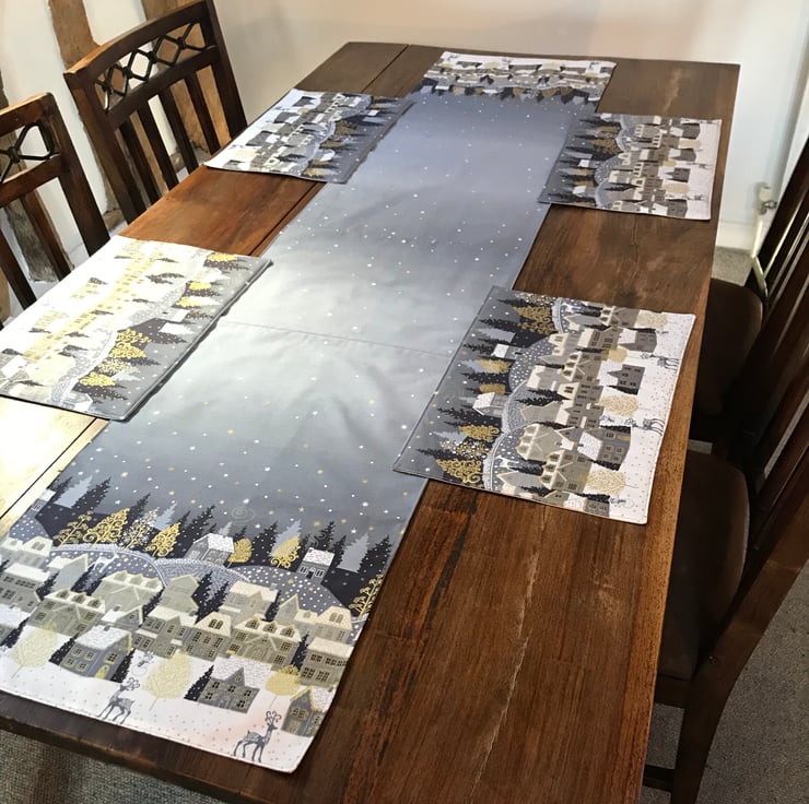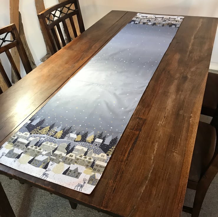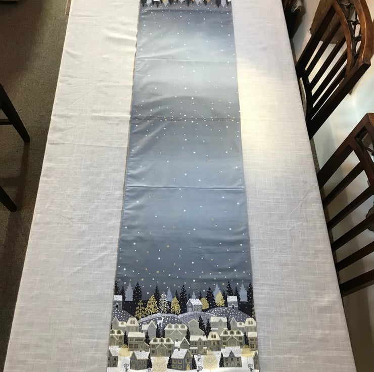 Brighten up your dining with this lovely festive table runner. Decorated with a delightful wintery village scene at either end joined by a starry night sky. Made of printed cotton fabric on the top and backed with taupe cotton.