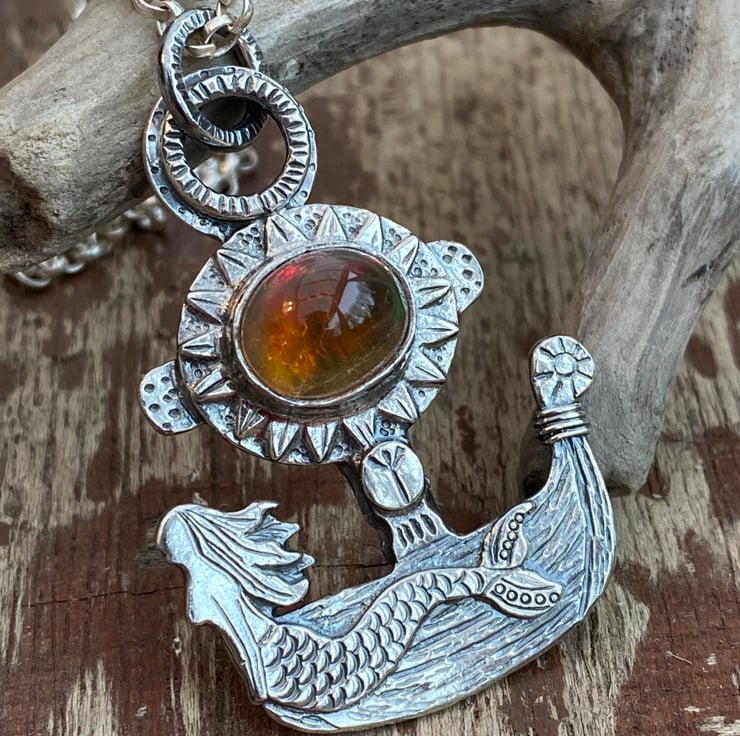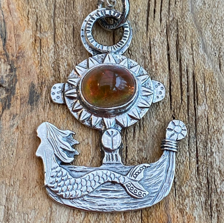 Using traditional jewellery making techniques, these little ships are one of my favourite makes. This one is inspired by my love of mermaids and vikings and has a beautiful Ethiopian opal cabochon set into the sail. Oxidised finish.