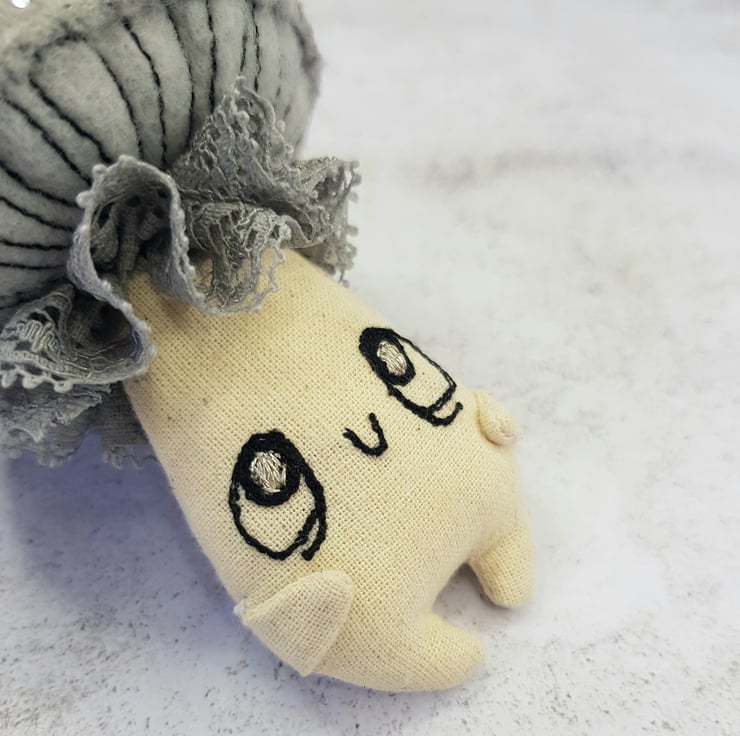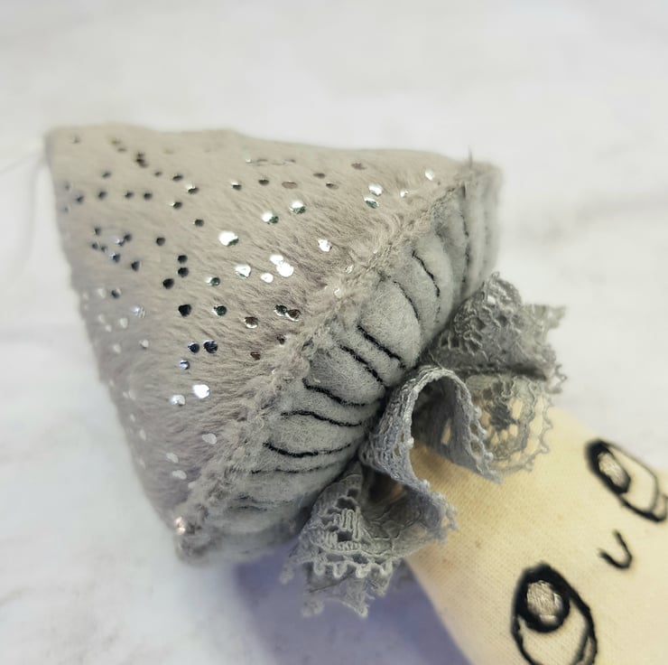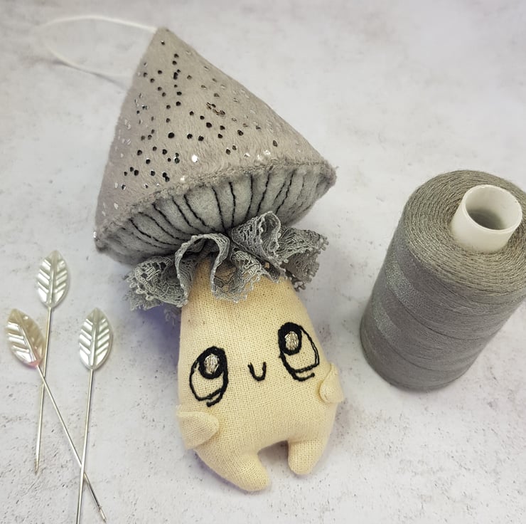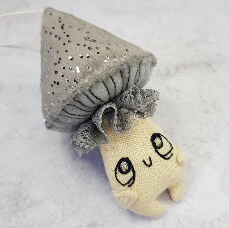 Beautiful decoration or a sweet gift for a budding mycophile. Soft, sparkly and cute, this little soft toadstool measures roughly 11.5cm tall and 6cm wide. The cap is plush with shiny silver speckles and is handsewn to the striped gills. This beautiful fungi has machine embroidered face with shiny silver eyes and a wax thread attached for hanging. Sent in recyclable packaging. This listing is for one toadstool only.