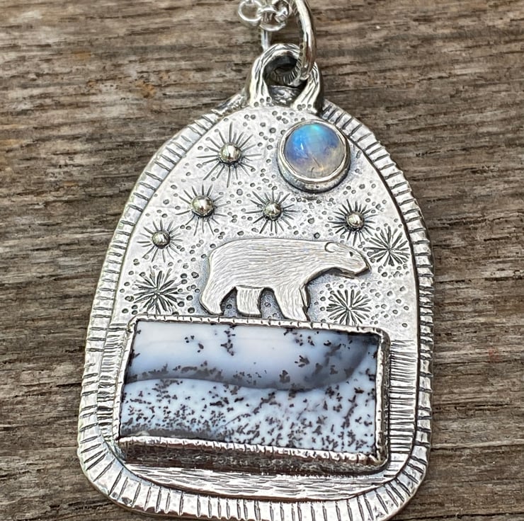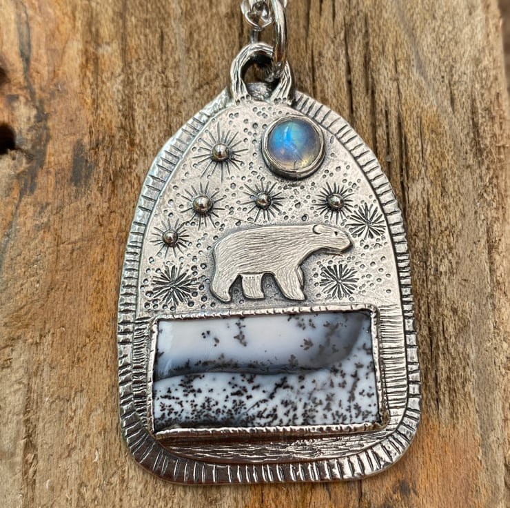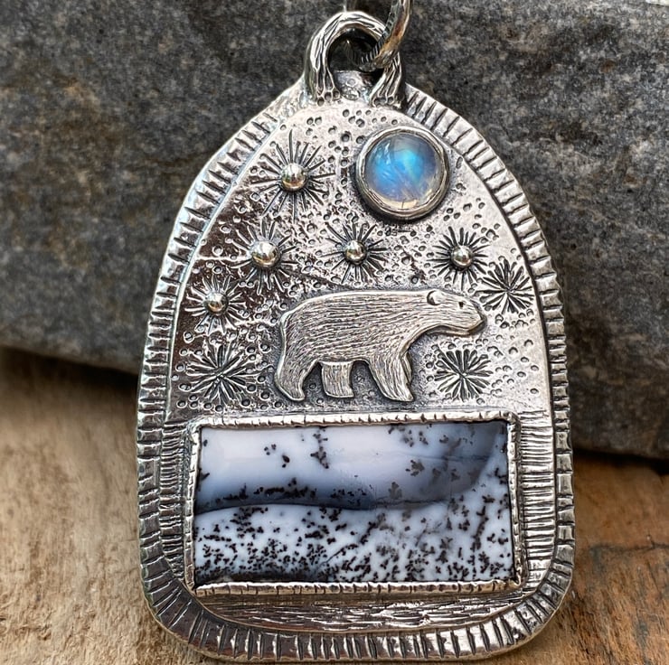 Using traditional jewellery making techniques I have made this polar bear pendant in sterling silver setting a beautiful dendritic opal and moonstone cabochon. Oxidised finish.