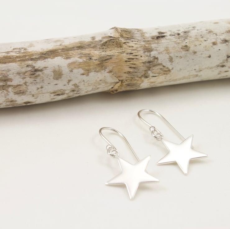 These pretty star earrings have been cut out from sterling silver sheet and soldered to a small jump ring so they can be displayed on handmade silver ear wires. The stars have been hand polished to a high shine so they sparkle in the light.