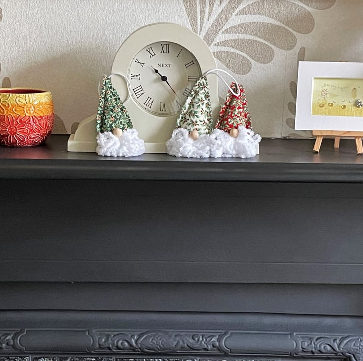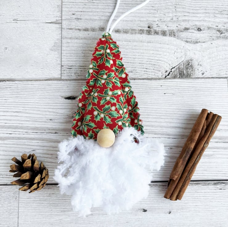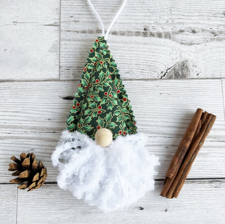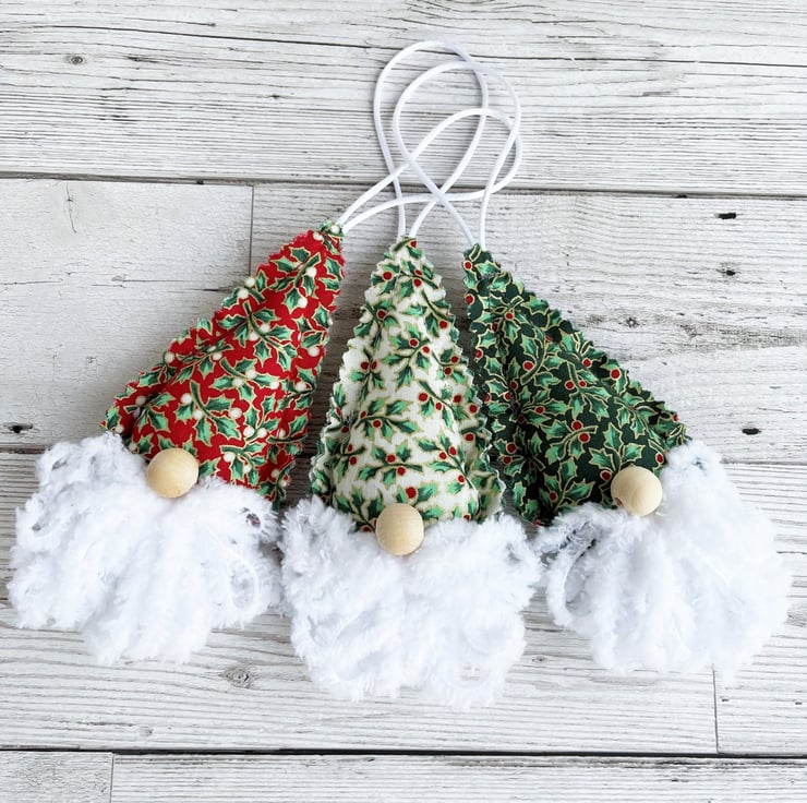 Set of 3 gnome hanging Christmas decorations. This set of cute gnome Christmas decorations includes one of each of type from my gnome range (purchasing a set, rather than the three individual versions, offers a saving of £1.50 in total). The gnomes each have a hat of holly and berries print fabric, and the set includes one each of cream, red, and green. The decorations are all made from the print fabric to which I’ve added a beard made from white snuggly chunky yarn, and a natural wood bead nose. The hat fabric has pinked edges to give a raw scalloped finish. The decorations are lightly padded with polyester hollow fibre filling and they have hanging loops made from white satin cord.