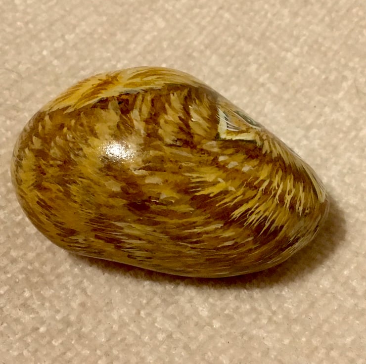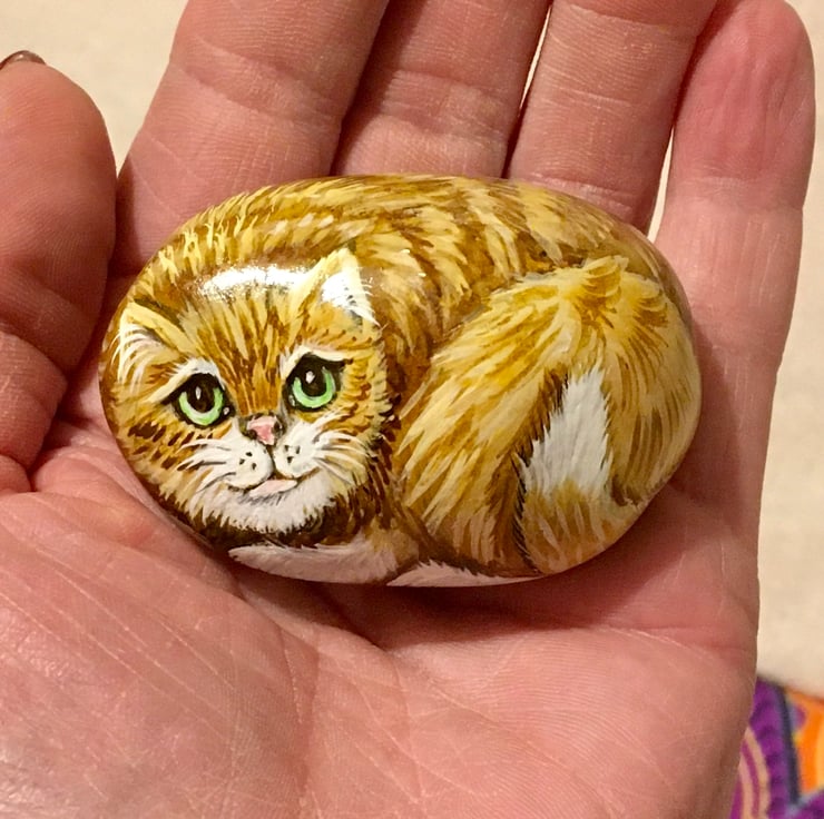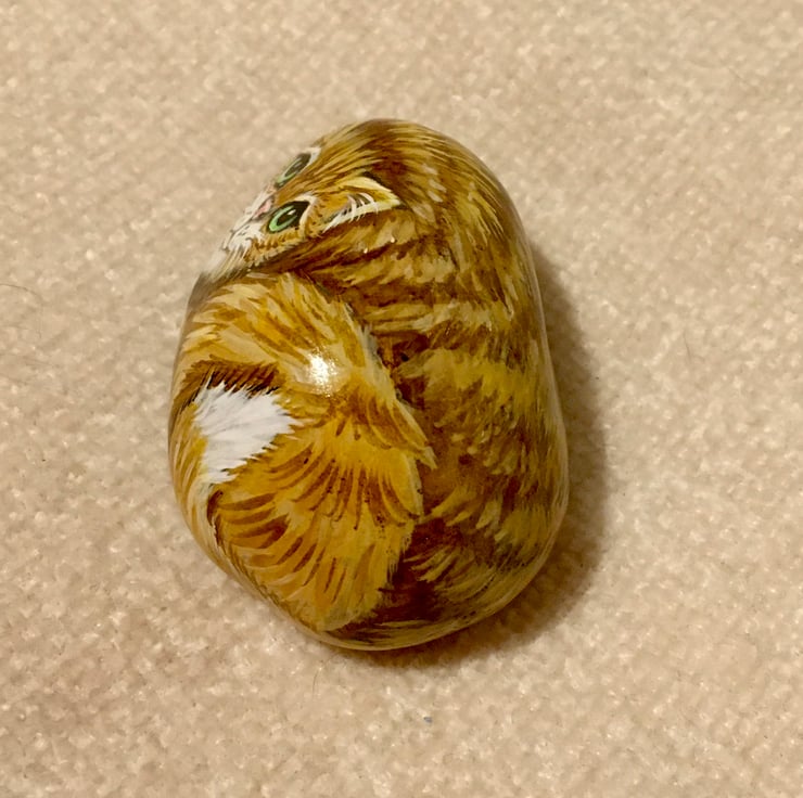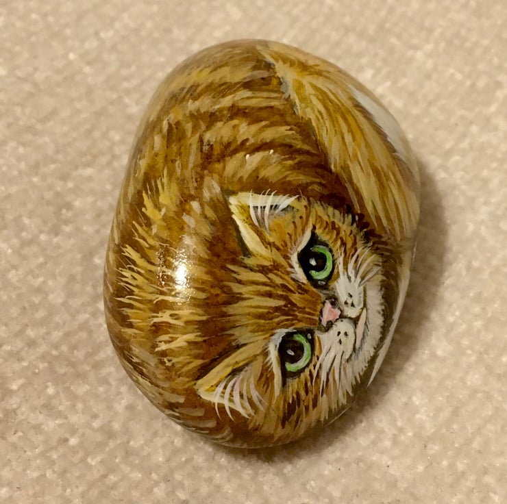This cat has been painted onto a smooth stone and glazed for a glossy protective finish
