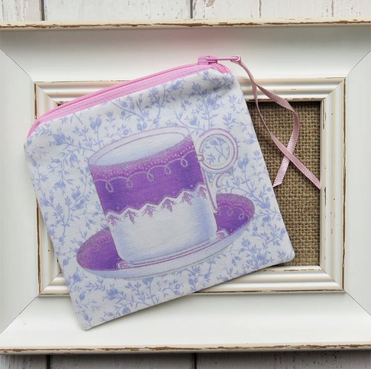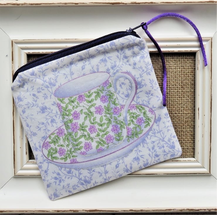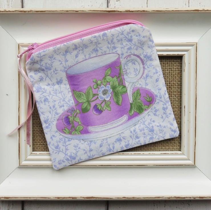 A zipped coin purse with assorted tea cups on both sides in shades of blue. Lined with a coordinating cotton fabric, the coin purse measures 11cm tall x 11.5cm wide.