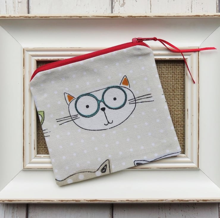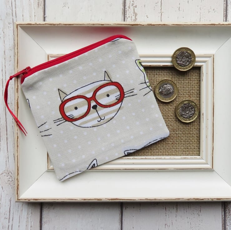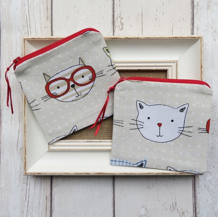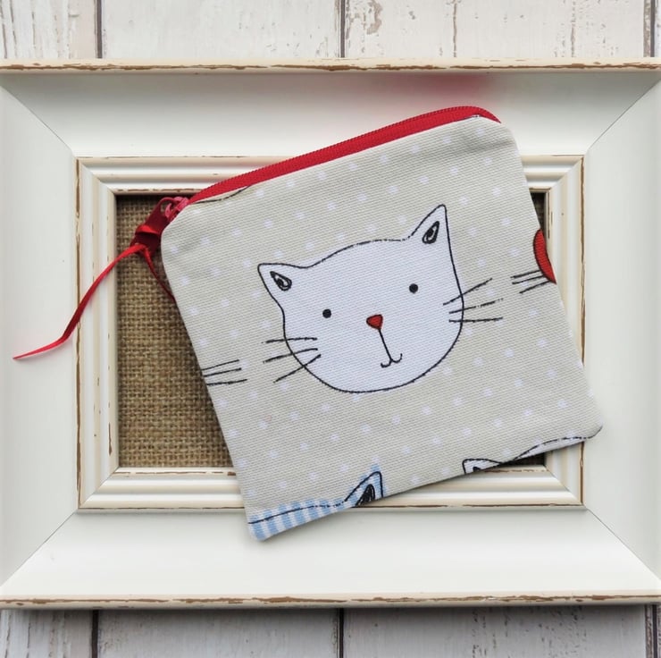 A zipped coin purse with assorted cartoon cat faces on both sides. Lined with a coordinating cotton fabric, the coin purse measures 11cm tall x 11.5cm wide.