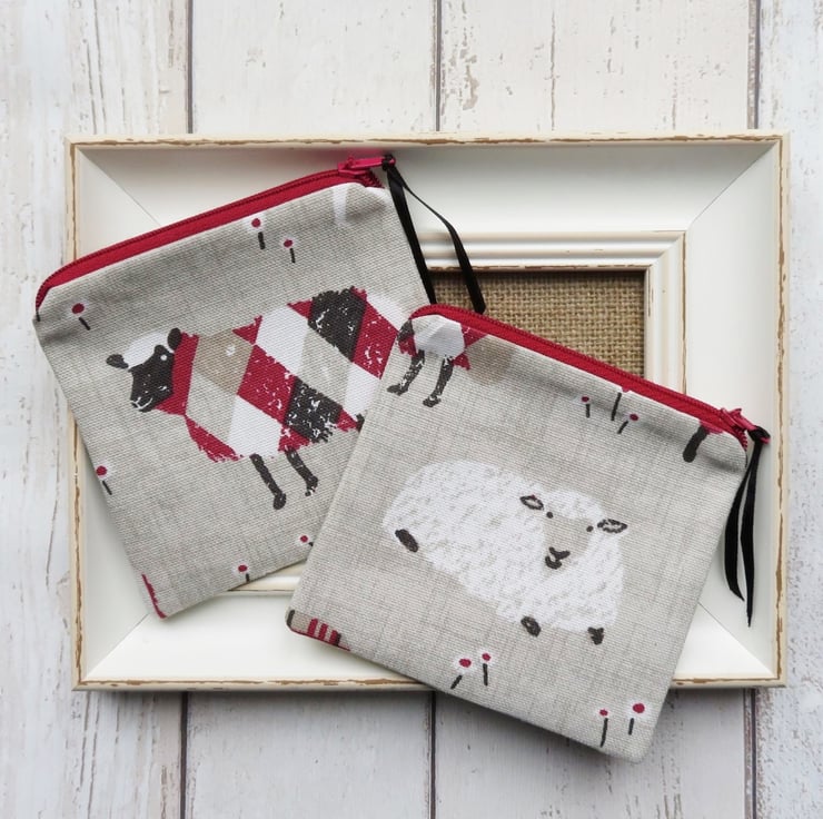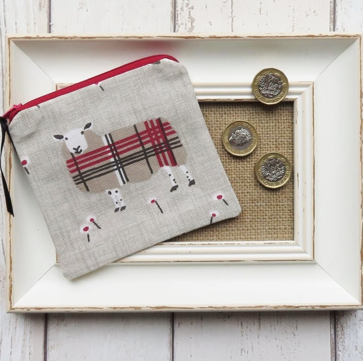 A zipped coin purse with assorted patterned sheep on both sides. Lined with a coordinating cotton fabric, the coin purse measures 11cm tall x 11.5cm wide.