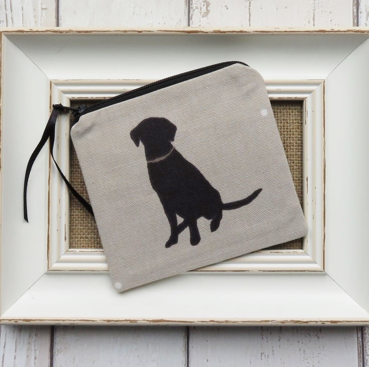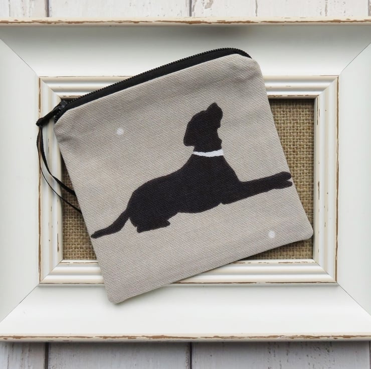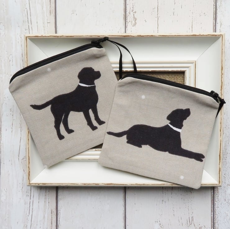 A zipped coin purse with a black labradors on a taupe background on both sides. Lined with a coordinating cotton fabric, the coin purse measures 11cm tall x 11.5cm wide.
