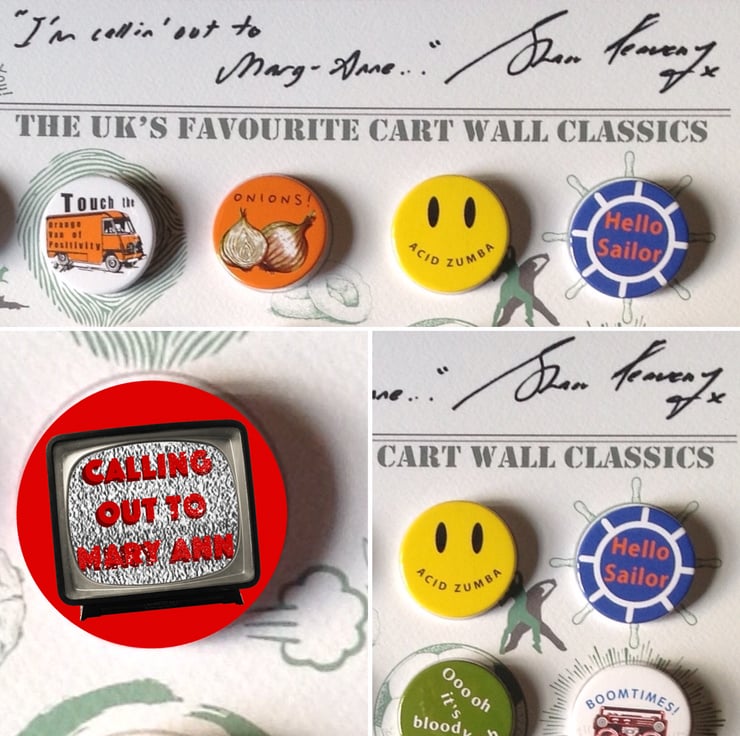 Featuring all 15 of our x38mm button pin badges inspired by the Cart Wall on a specially designed A4 card backing each piece has been hand inscribed with a unique message from Shaun himself, no two are the same, so choose carefully as when they're gone, they're GONE!