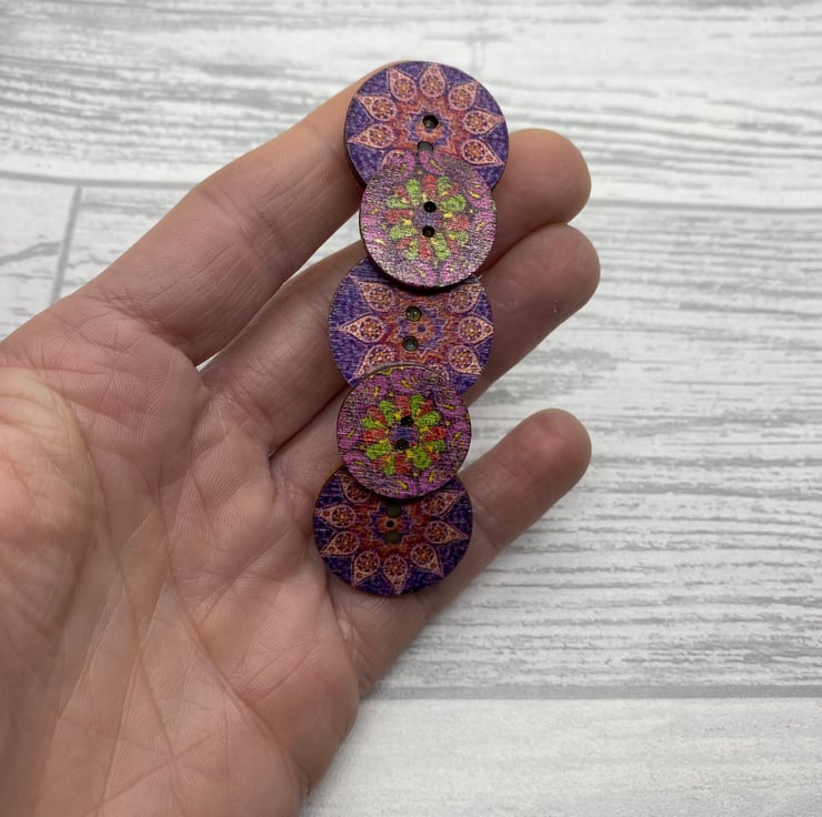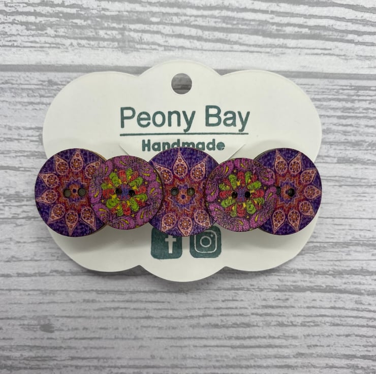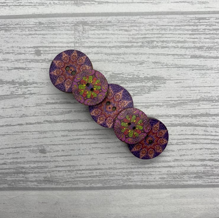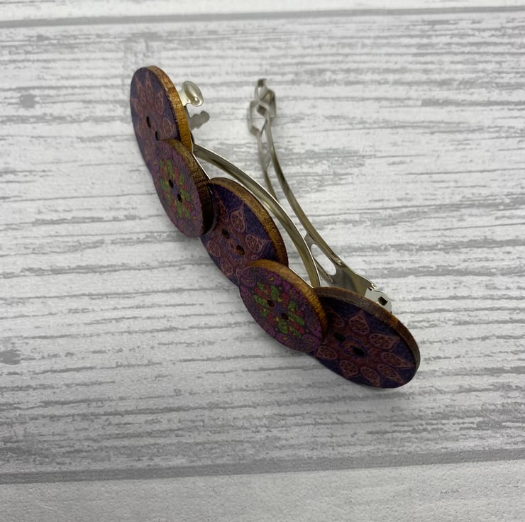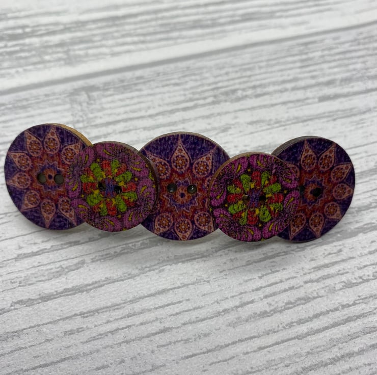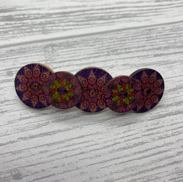 This barrette has five buttons with two mandala designs. There are three larger matching buttons on the bottom row. Then there are two smaller matching buttons on the top row. All are in shades of purple.