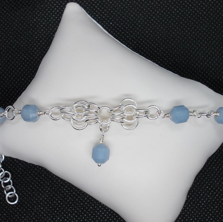 This chainmaille bracelet features the butterfly weave and angelite stones.