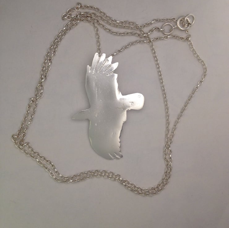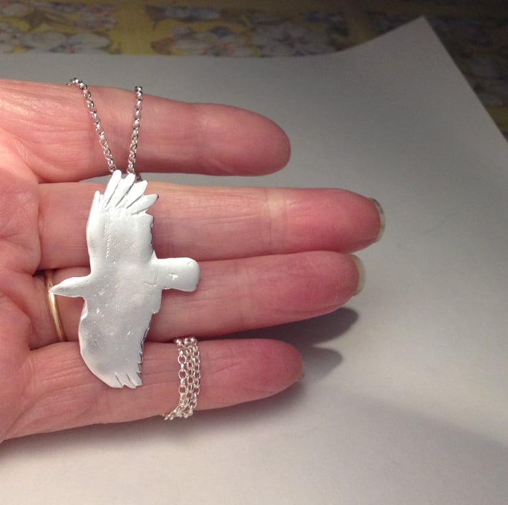 Flying crow silhouette in fine silver catches the light beautifully. Fine silver does not tarnish being 99% pure silver so a simple buff from time to time will keep him shiny and bright. Measuring 32mm wide by 45mm long the pendant comes with a sterling silver chain length of your choice.