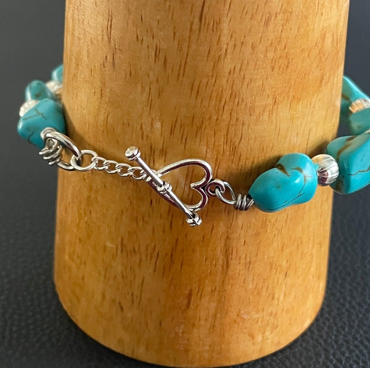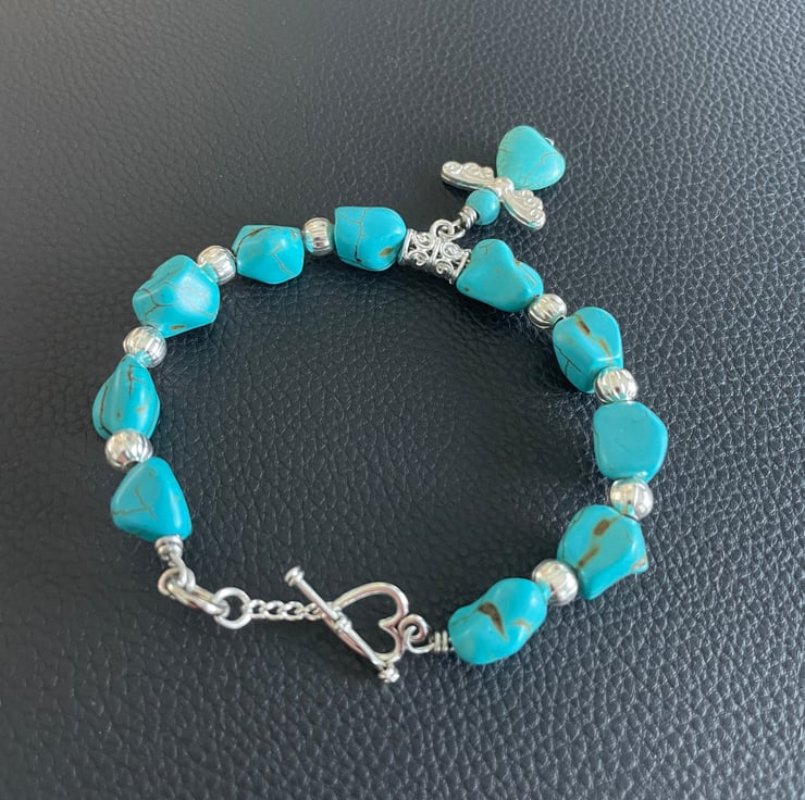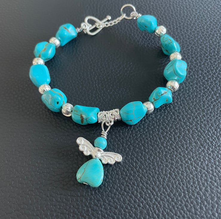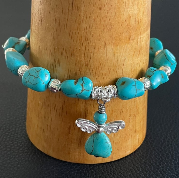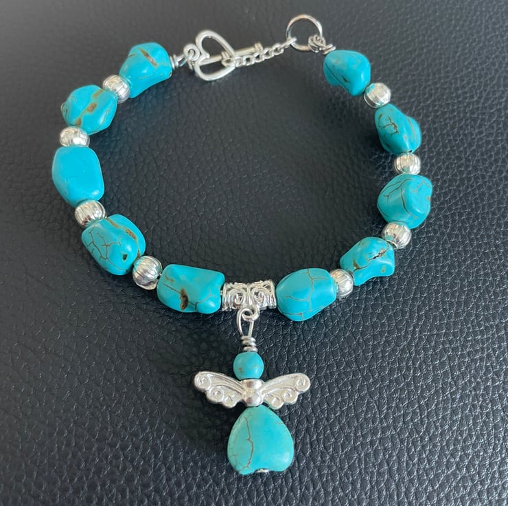 Made by hand with strong stainless-steel wire, a selection of Howlite (dyed turquoise) beads and silver tone spacer beads. I embellished the piece with a lovely angel in the centre. The bracelet holds its shape well, but I further added a cute heart toggle clasp.