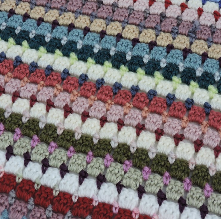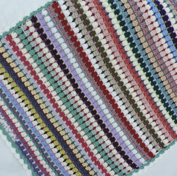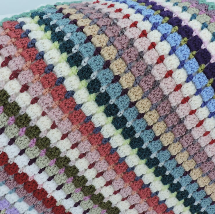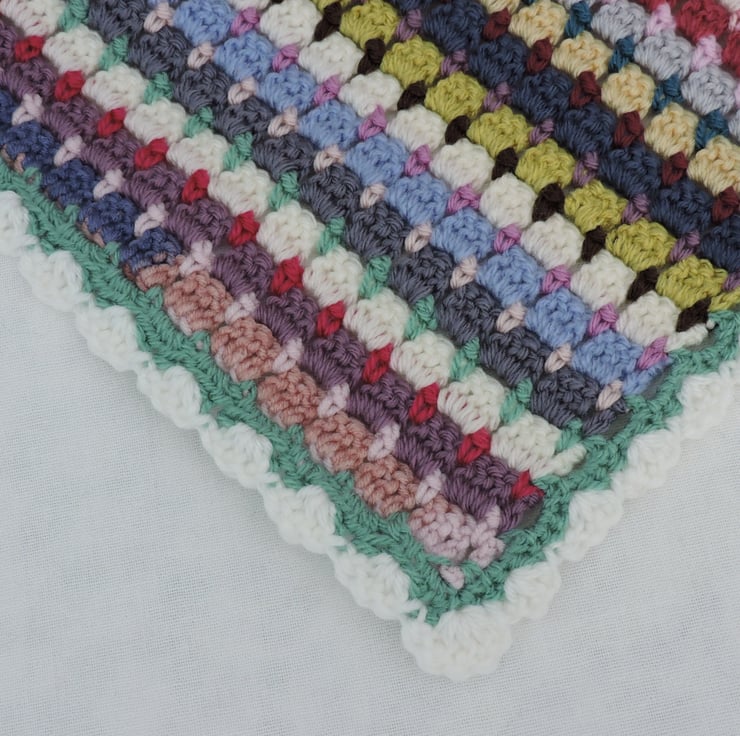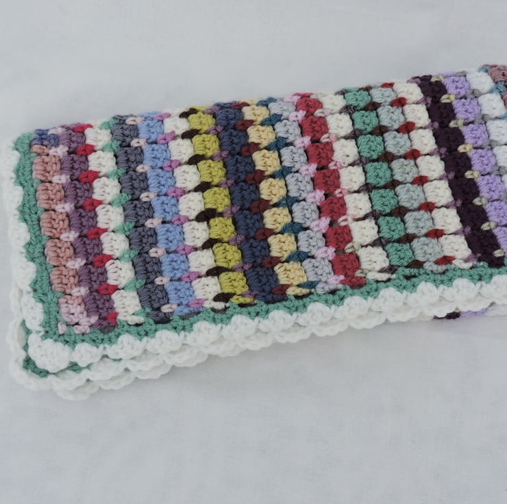 This small colourful crochet blanket with multi coloured stripes has been made with 100% premium acrylic double knit yarns. A multitude of different colours has been used and it is finished with a wavy white border. A warm and cosy little pram or crib blanket, or pet or doll blanket. Cool wash recommended and dry naturally.