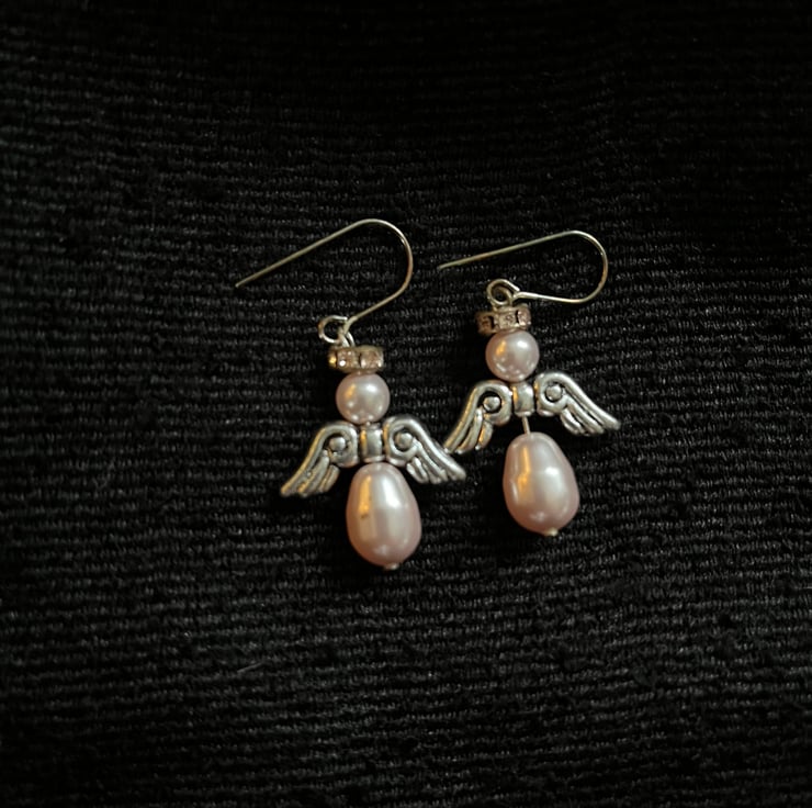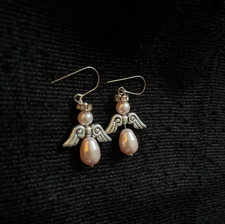 Lovely Swarovski hand beaded Christmas Angel earrings Swarovski Crystal halo beads and Pink pearls with silver coloured wings. Very pretty and twinkly. They catch the light really nicely like diamonds.