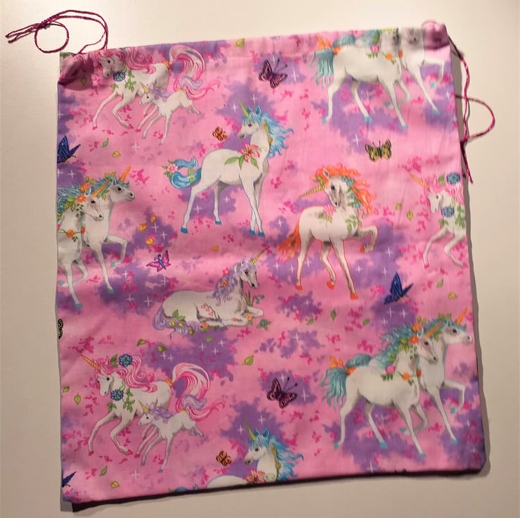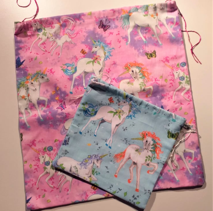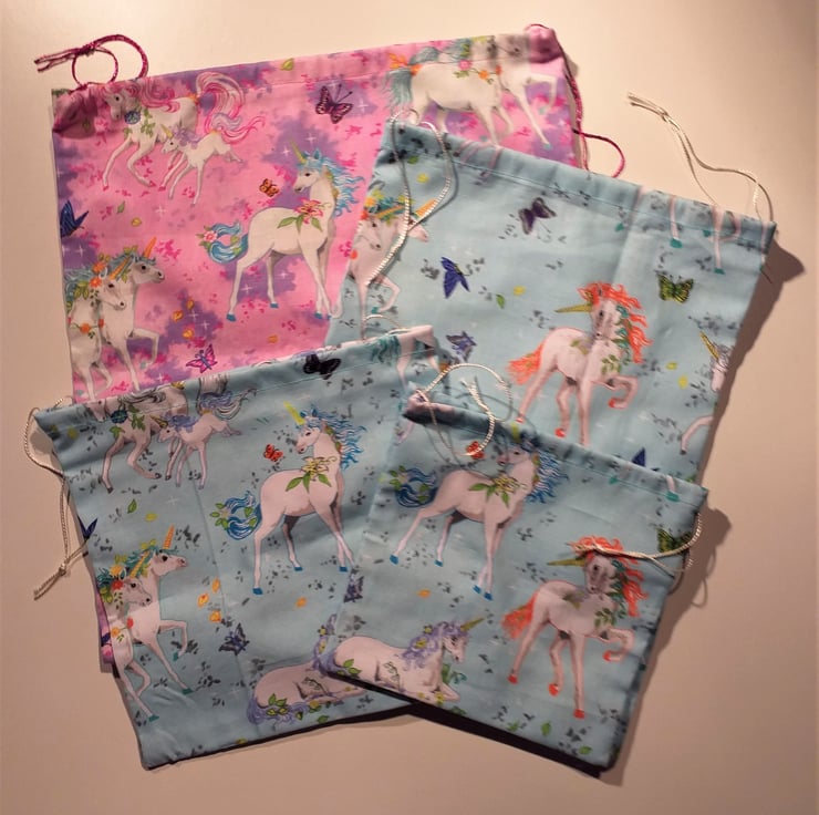 This is a fun set of four light blue or pink and mauve drawstring bags with white unicorns outlined in orange, magenta or blue all over them to make special gifts even more special. The largest bag is pink and measures 9.5".(24cm.) x 10.5" (27cm.) approximately. The other bags are blue, the biggest of which measures 7" (18cm.) x 10" (25cm.) and the smallest 5.5" square (13 cm.) They are cotton, washable and reusable.