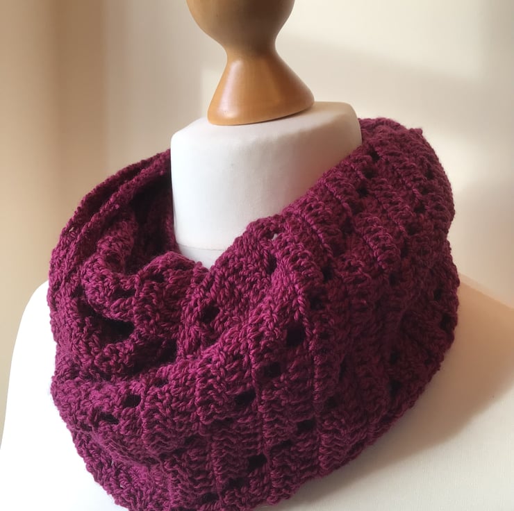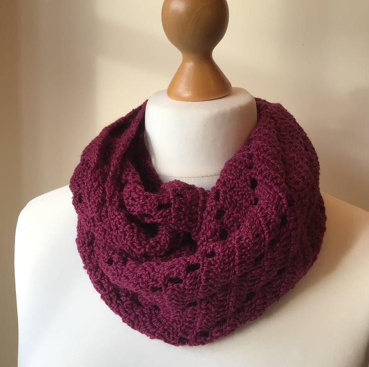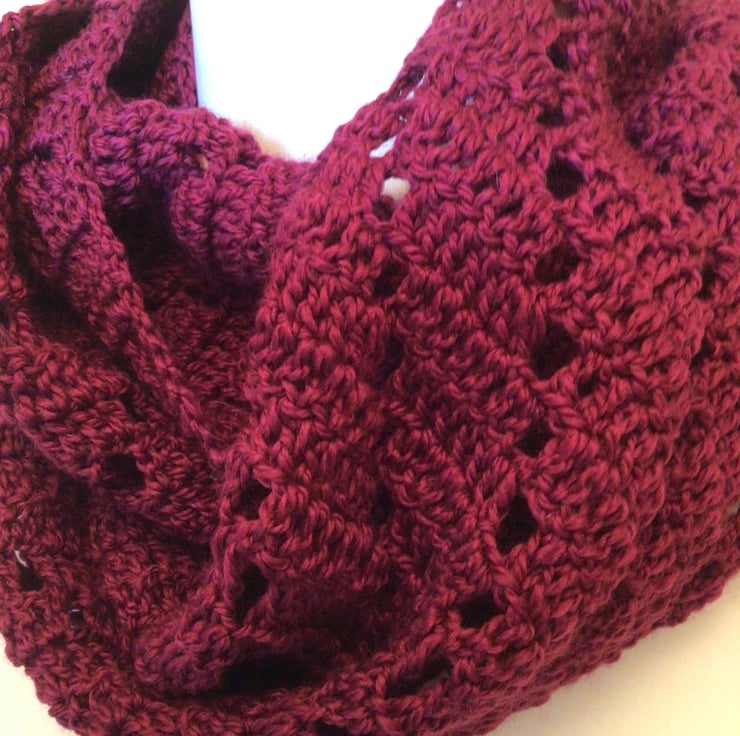 This gorgeous infinity scarf measures approximately 25cm wide x 120cm long. I have hand crocheted it in a finer 4 ply wool with a loose stitch so there will be some stretch in this scarf.