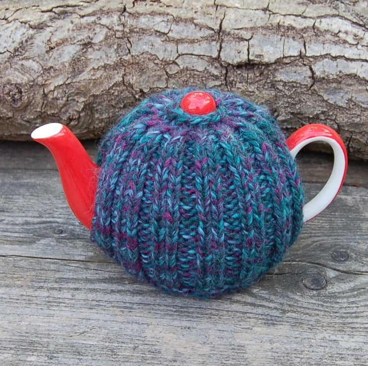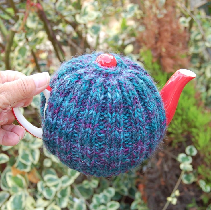 A lovely tea cosy knitted using a lovely multi toned wool mix yarn.