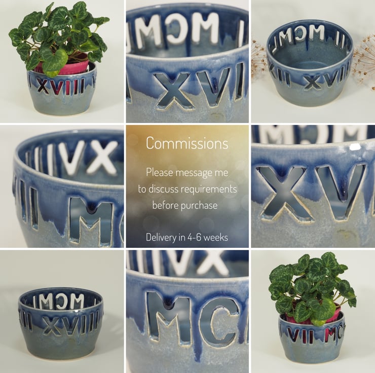 - Blue planter/candle holder with a special date carved out in Roman Numerals