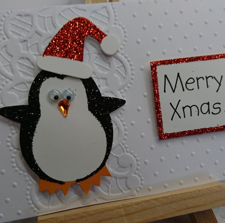 The design is a penguin wearing a red glitter hat. His googly eyes are really fun!