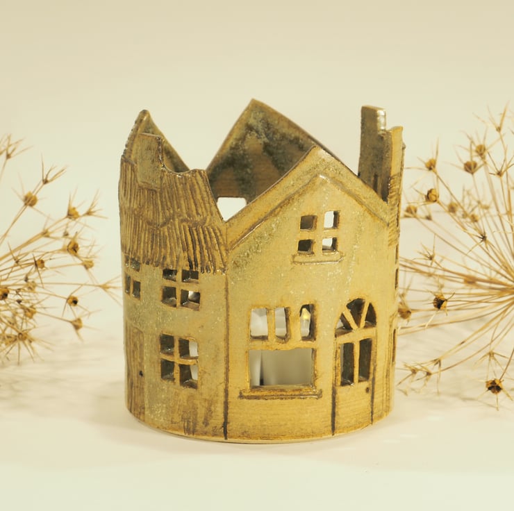 A quaint street scene on a pot! The windows are cut out so it makes a great candle holder, alternatively fill with a bundle of christmas lights, and let the light shine through. Made from stoneware clay on the potters wheel and then hand carved to create 5 individual little houses. Hand-decorated in a mix of glaze and oxide to pick out the detail of the carving.