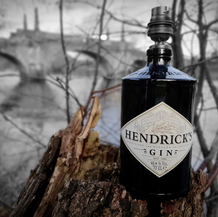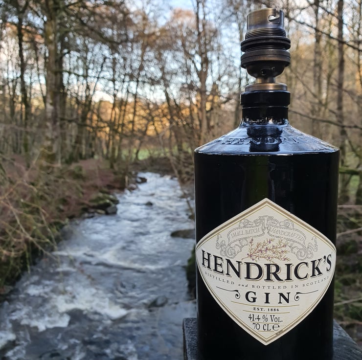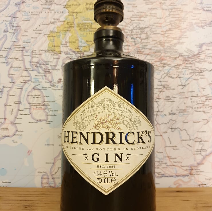 This lamp is made from a Hendricks Gin bottle and comes with an antique brass finish, with in-line cable switch.