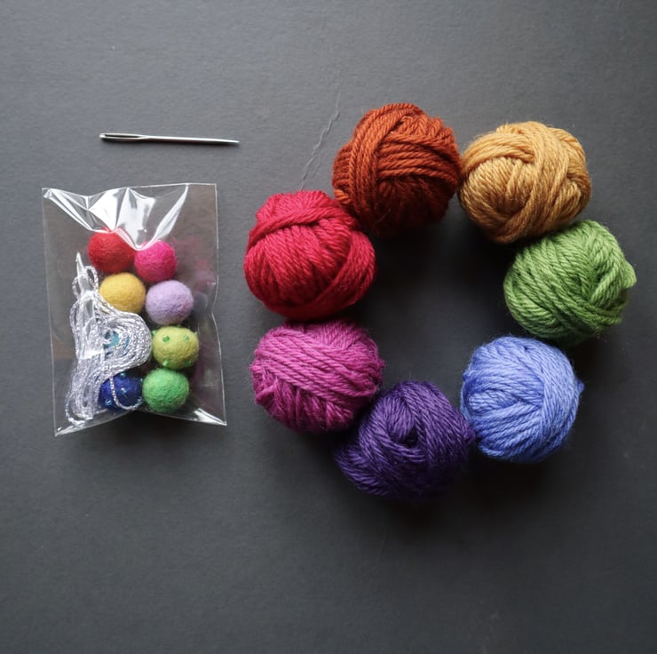 This is a listing for a knitting kit to knit small rainbow bunting flags.