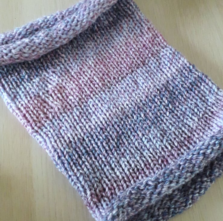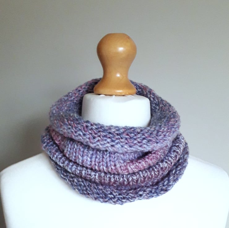 This beautiful cowl has been knitted from soft, chunky acrylic yarn.