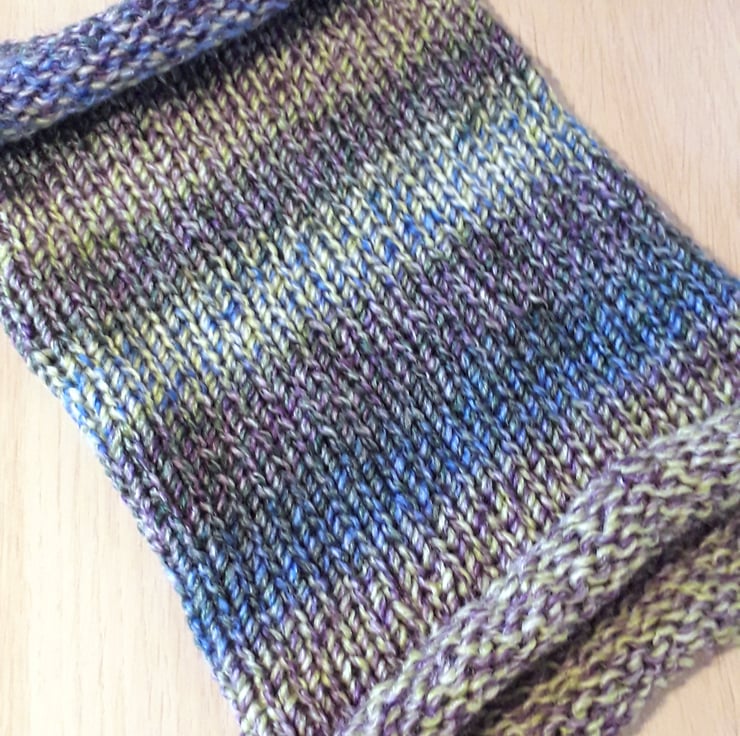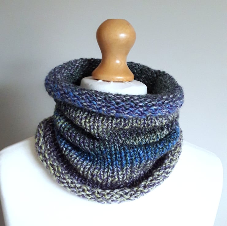 This beautiful cowl has been knitted from soft, chunky acrylic yarn.