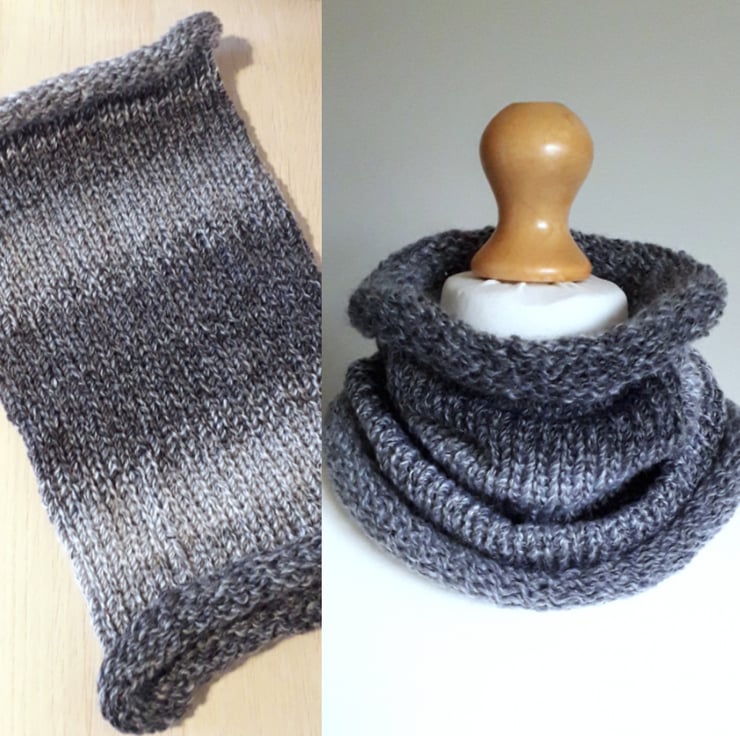 This beautiful cowl has been knitted from soft, chunky acrylic yarn.