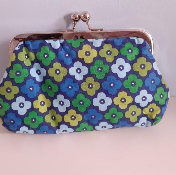 Made from a medium weight cotton flower design outer fabric and lined with a contrasting baby blue and white spotted fabric. The clasp is a strong silver coloured clasp.