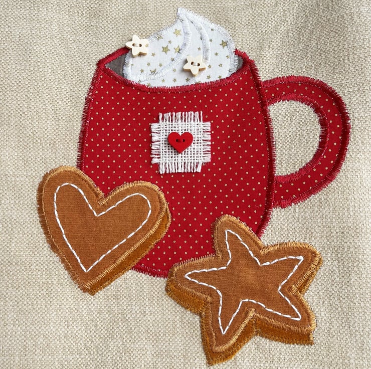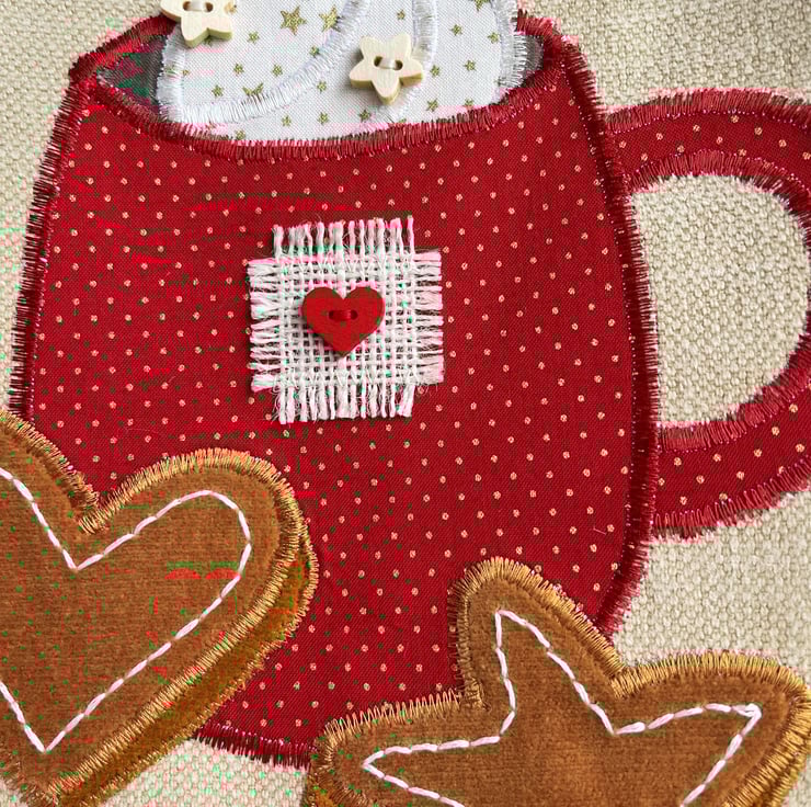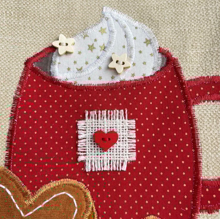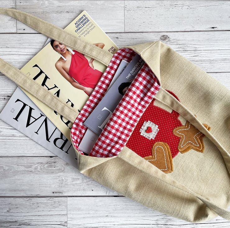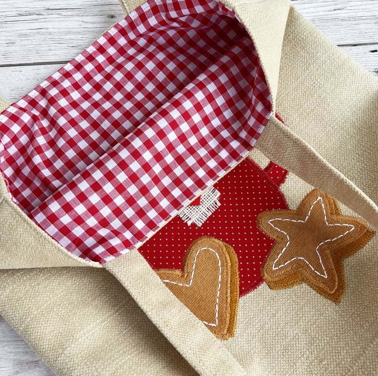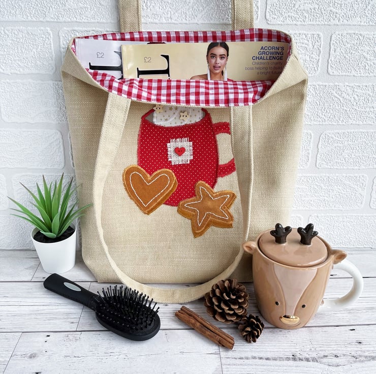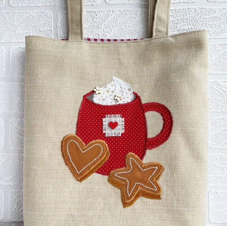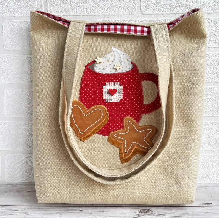 Hot chocolate or coffee tote bag. This lovely tote bag is made from caramel coloured fabric with an appliqué scene featuring a mug of hot chocolate or coffee with whipped cream and gingerbread biscuits. The mug is made from red fabric with tiny gold polka dots. I’ve decorated the mug with a square of cream frayed hessian and a red wooden heart-shaped button. The whipped cream is made from cream fabric with gold stars, to which I’ve added two natural wood star-shaped buttons. The gingerbread star and heart are made from two shades of ginger coloured velvet on which I’ve hand embroidered icing in white thread. The bag is lined with red and white gingham fabric.