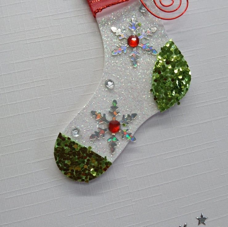 The design is a beautiful very sparkly Christmas stocking made with mixed media such as glitter, sequins, ribbon, silver foil, gems, and wire. I wonder what will be put inside?
