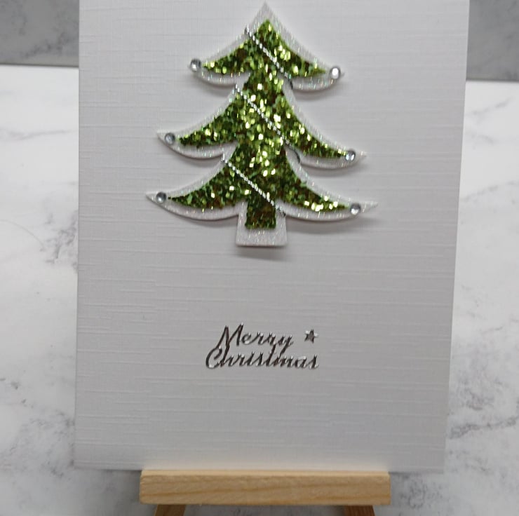 The design is a beautiful very sparkly Christmas tree made with mixed media such as glitter, sequins, gems, and wire. I wonder what presents will be put underneath it?