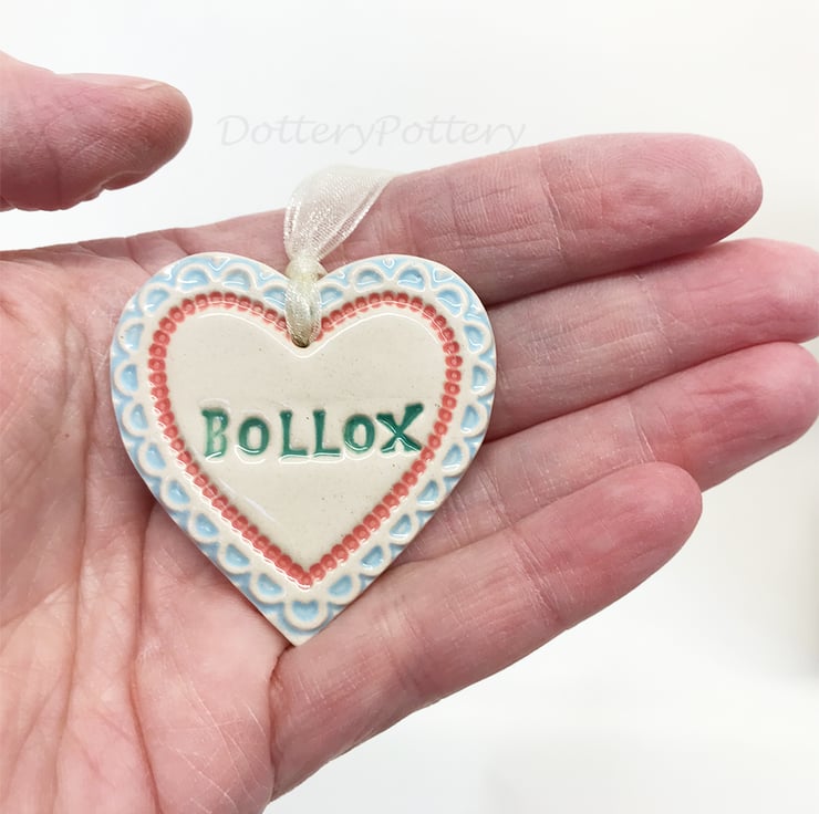 This little heart is made from white earthenware clay, imprinted with the words BOLLOX The perfect gift to let someone know how much you love them! Some of the letters may be a bit higgledy piggledy but they have been stamped with love! It has been fired twice, once to the bisque stage and then a second firing for the clear glaze. It measures 4.5 centimetres wide x 5cm height x 5mm thick. It can be hung outside. (The last photo is to give you an idea of size and will not be the heart that you receive)