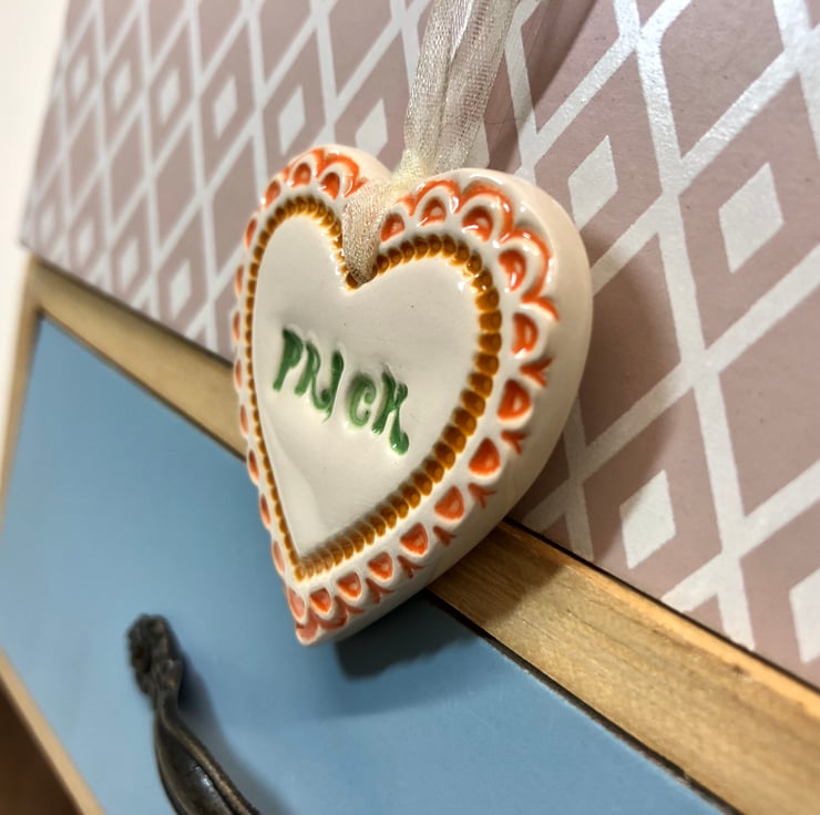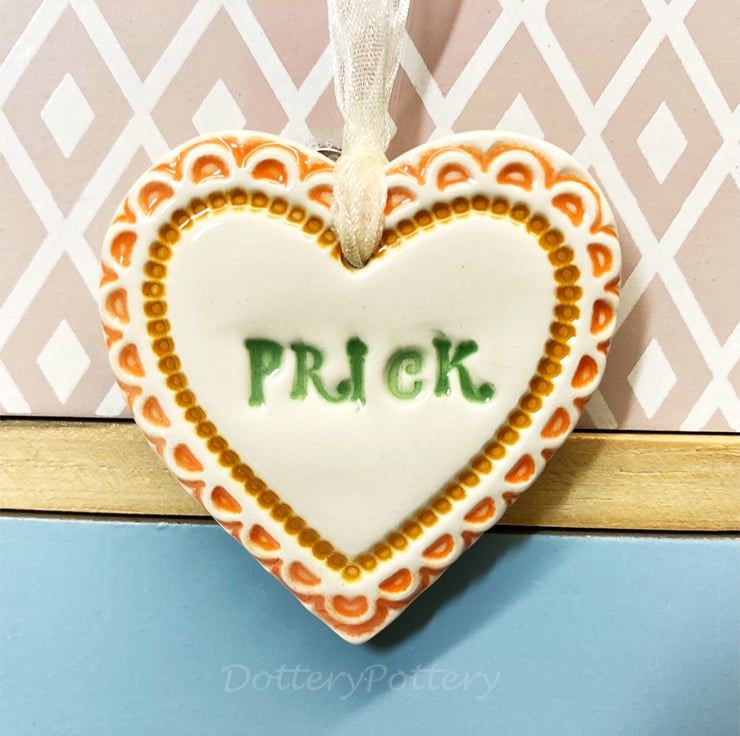 This little heart is made from white earthenware clay, imprinted with the words PRICK The perfect gift to let someone know how much you love them! Some of the letters may be a bit higgledy piggledy but they have been stamped with love! It has been fired twice, once to the bisque stage and then a second firing for the clear glaze. It measures 4.5 centimetres wide x 5cm height x 5mm thick. It can be hung outside. (The last photo is to give you an idea of size and will not be the heart that you receive)