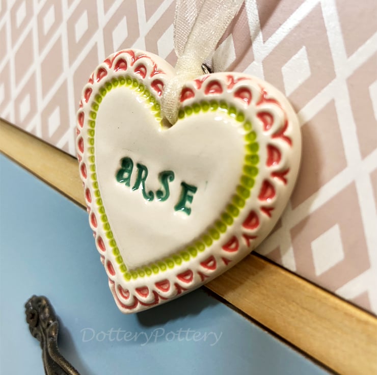 This little heart is made from white earthenware clay, imprinted with the words ARSE The perfect gift to let someone know how much you love them! Some of the letters may be a bit higgledy piggledy but they have been stamped with love! It has been fired twice, once to the bisque stage and then a second firing for the clear glaze. It measures 4.5 centimetres wide x 5cm height x 5mm thick. It can be hung outside. (The last photo is to give you an idea of size and will not be the heart that you receive)