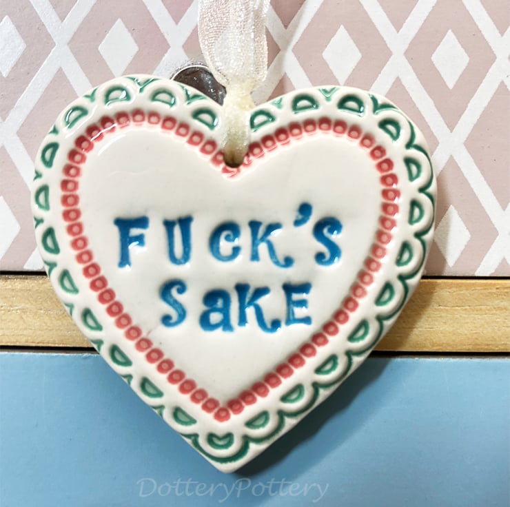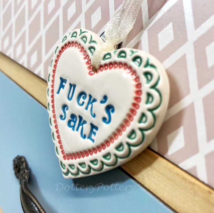 This little heart is made from white earthenware clay, imprinted with the words FUCK'S SAKE The perfect gift to let someone know how much you love them! Some of the letters may be a bit higgledy piggledy but they have been stamped with love! It has been fired twice, once to the bisque stage and then a second firing for the clear glaze. It measures 4.5 centimetres wide x 5cm height x 5mm thick. It can be hung outside. (The last photo is to give you an idea of size and will not be the heart that you receive)